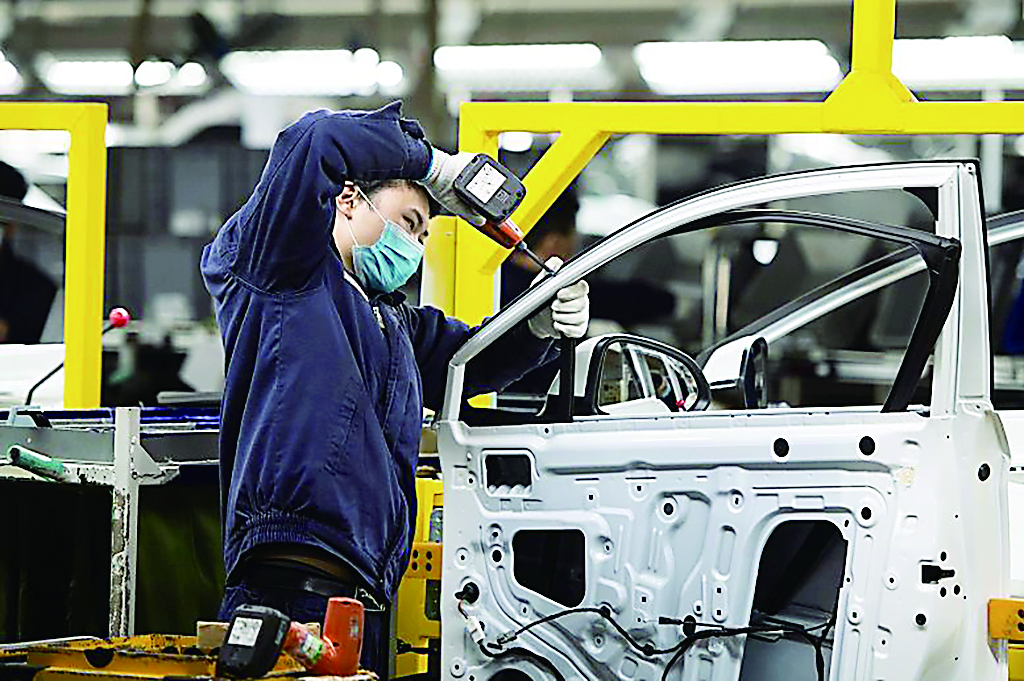 工人在株洲市天元区北汽株洲二工厂总装车间装配车门。 陈思汗 摄