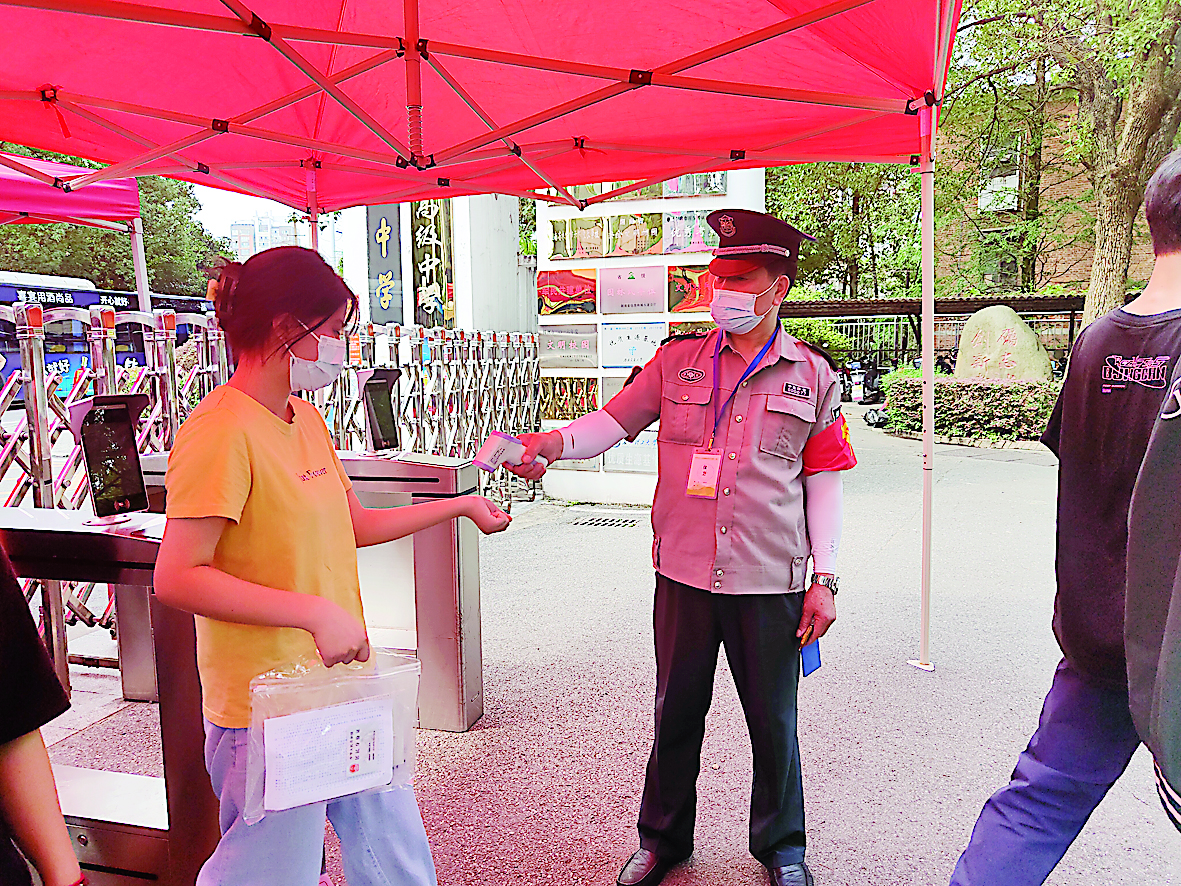 ◀在九方中学考点,工作人员为前来踩点的考生现场测温。 株洲日报全媒体记者/孙晓静 通讯员/李璐 摄