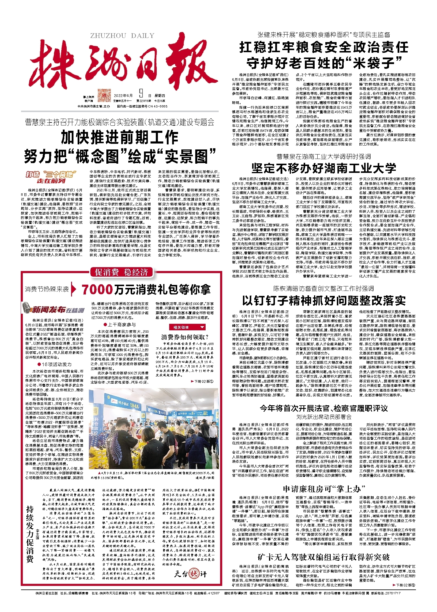 张健对株洲各地粮食生产的喜人来势表示充分肯定。他强调,粮食是人民群众最基本的生活资料,要坚决扛牢粮食安全政治责任,压紧压实党政同责,落细落地保面增效,从严从紧督促考核,坚决扛稳扛牢粮食安全政治责任;要扎实推进高标准农田建设,扎实开展撂荒地整治,让“沉睡”的耕地焕发新生机,奋力夺取全年粮食和农业丰收;要更好地发挥龙头企业、合作社辐射带动作用,带动农民增产增收;要加强人才引进和队伍建设,鼓励、吸引更多年轻人回农村就业创业;各级政协要深刻认识稳定粮食播种面积对确保粮食安全的重要性,积极配合联动推进做好全省政协系统“稳定粮食播种面积”专项民主监督工作,在助推扛稳粮食安全重任中贡献政协力量。