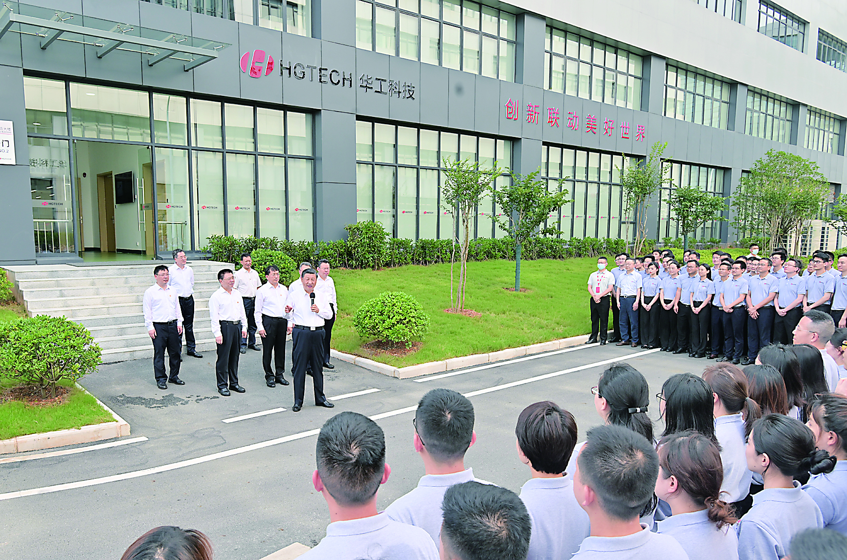 6月28日下午,习近平在武汉华工激光工程有限责任公司车间大楼前,同企业职工亲切交流。 新华社记者 李涛 摄