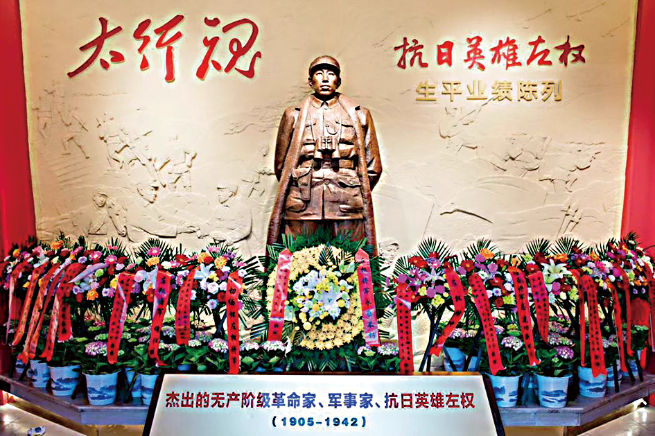 在醴陵市左家老屋,左权塑像前摆满了鲜花。