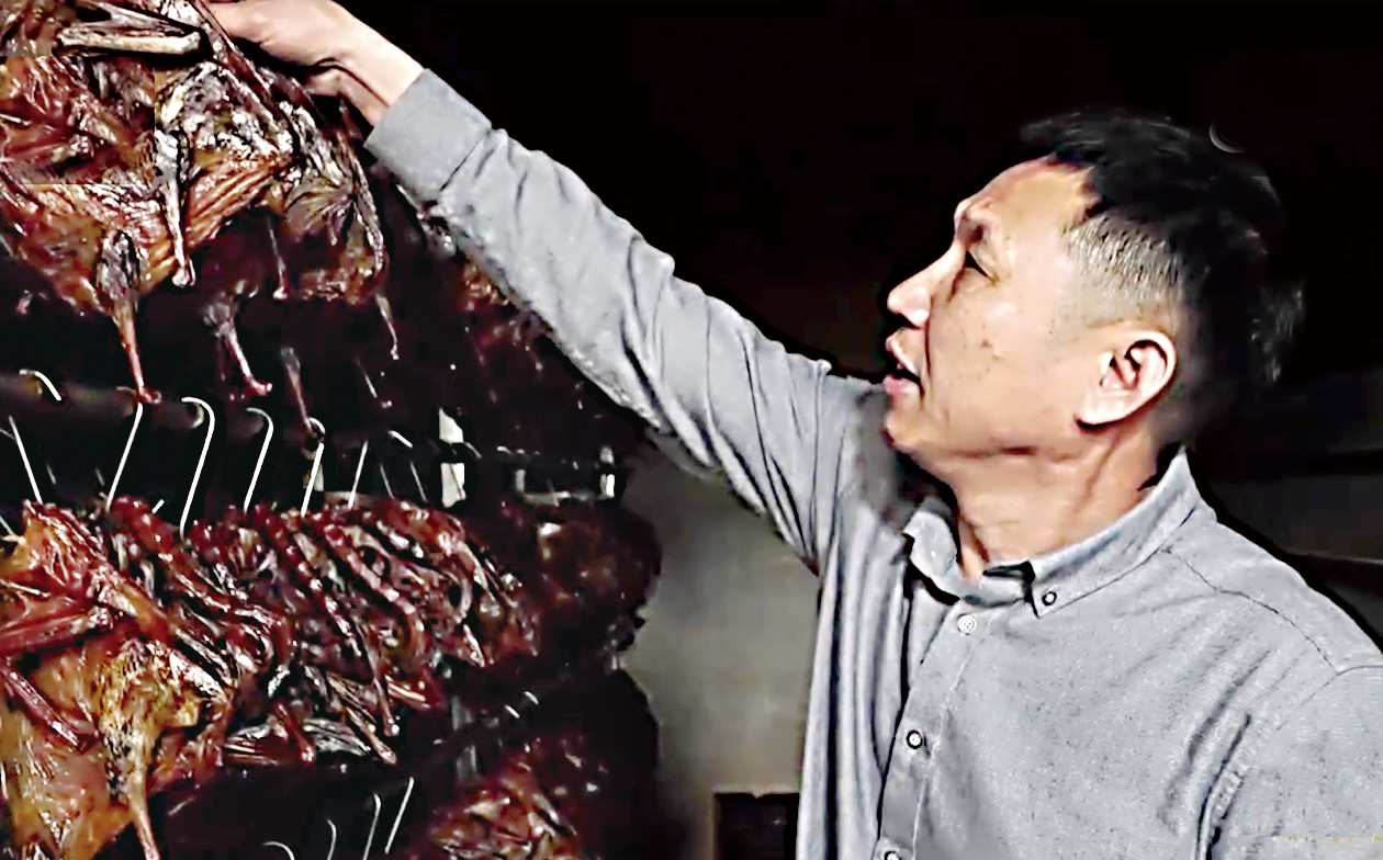 周小良在仔细查看烤房里的酱板鸭。