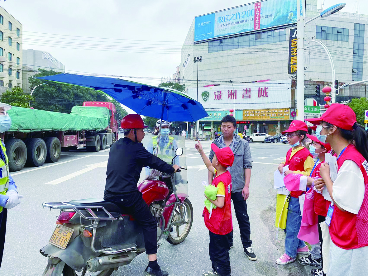 小记者和交警叔叔一起处理不文明交通行为。 株洲日报全媒体记者/刘文 通讯员/颜蓉 摄