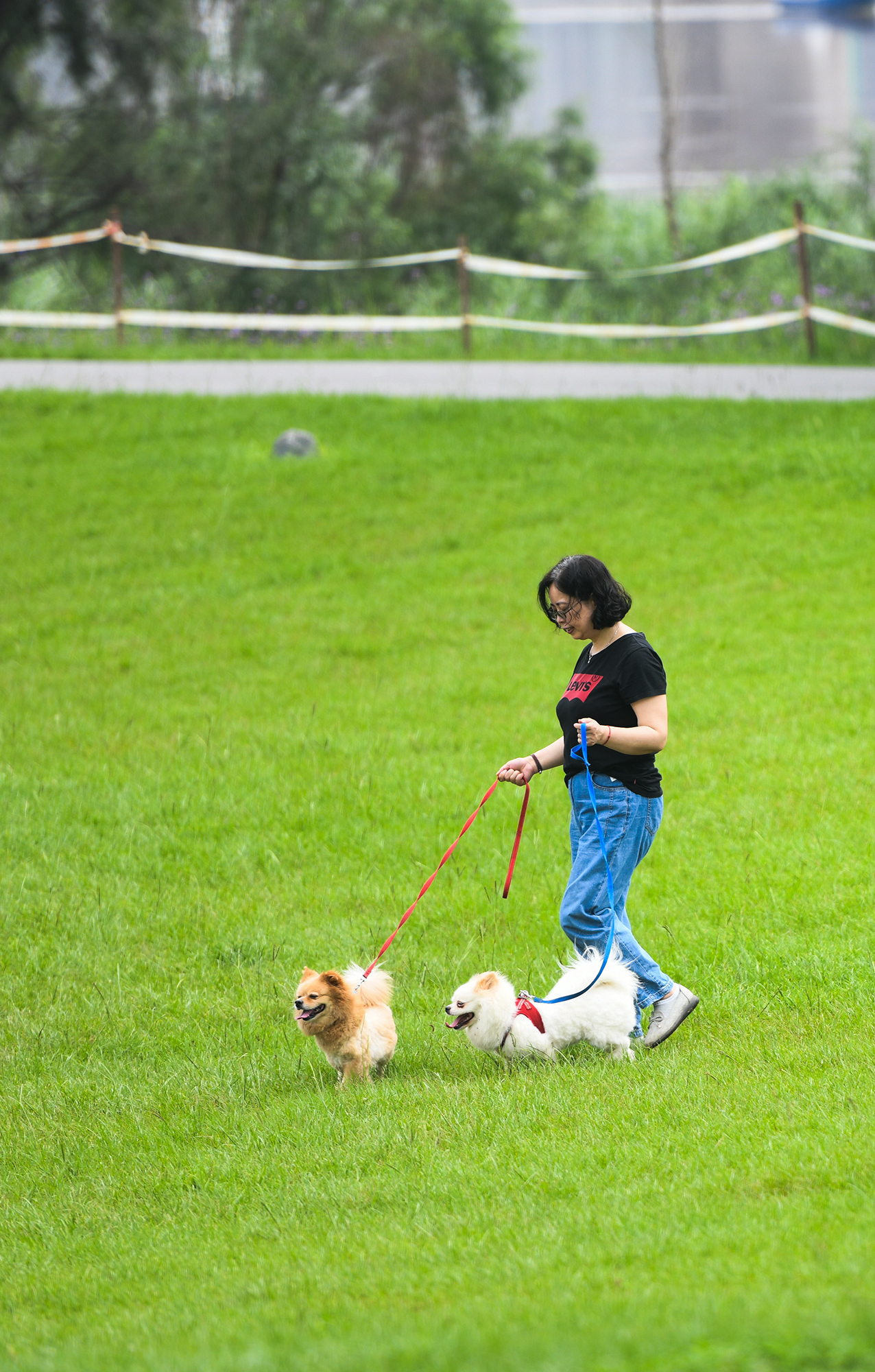 湘江风光带,市民牵着狗狗散步。