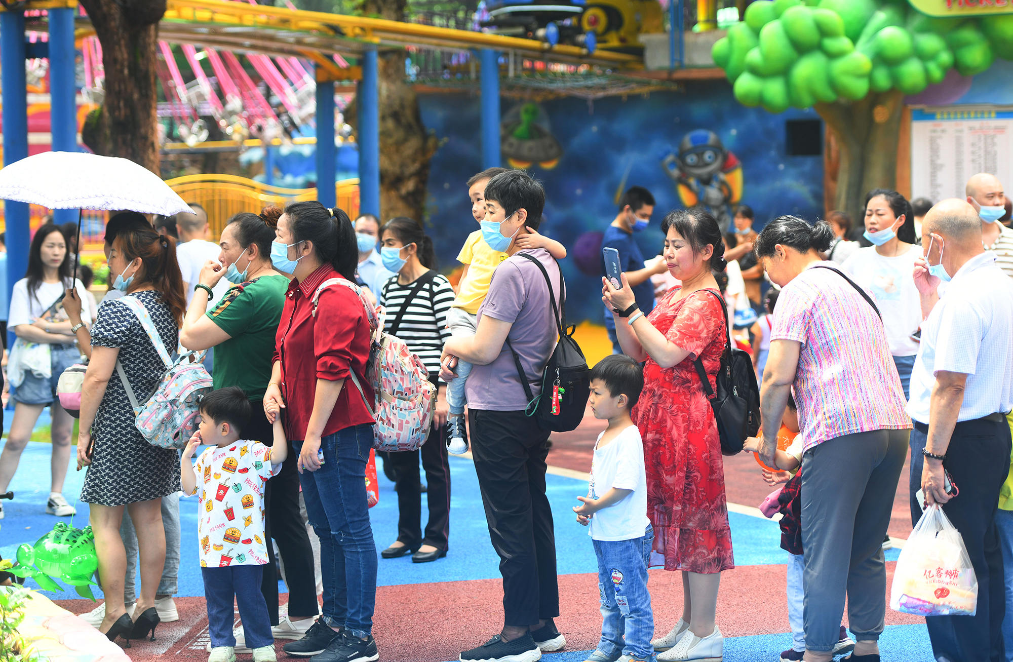 神农公园,市民有秩序地排队进入各游乐场。