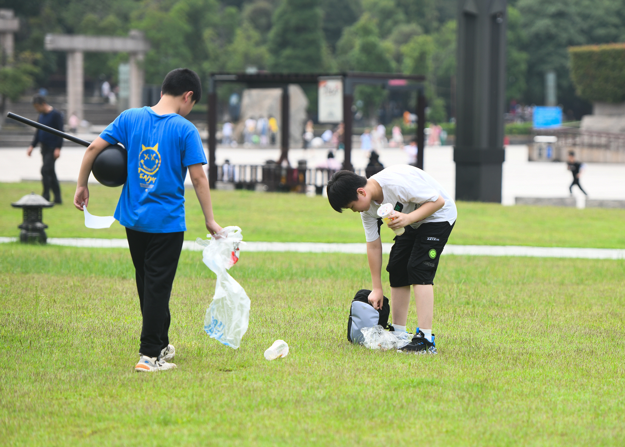 神农城广场绿地,市民自觉带走随身垃圾。