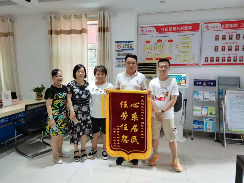 荷塘区茨菇塘街道天鹅社区网格员谭智奇接受居民送来的锦旗。 荷塘区网格中心 刘惠玲 供图