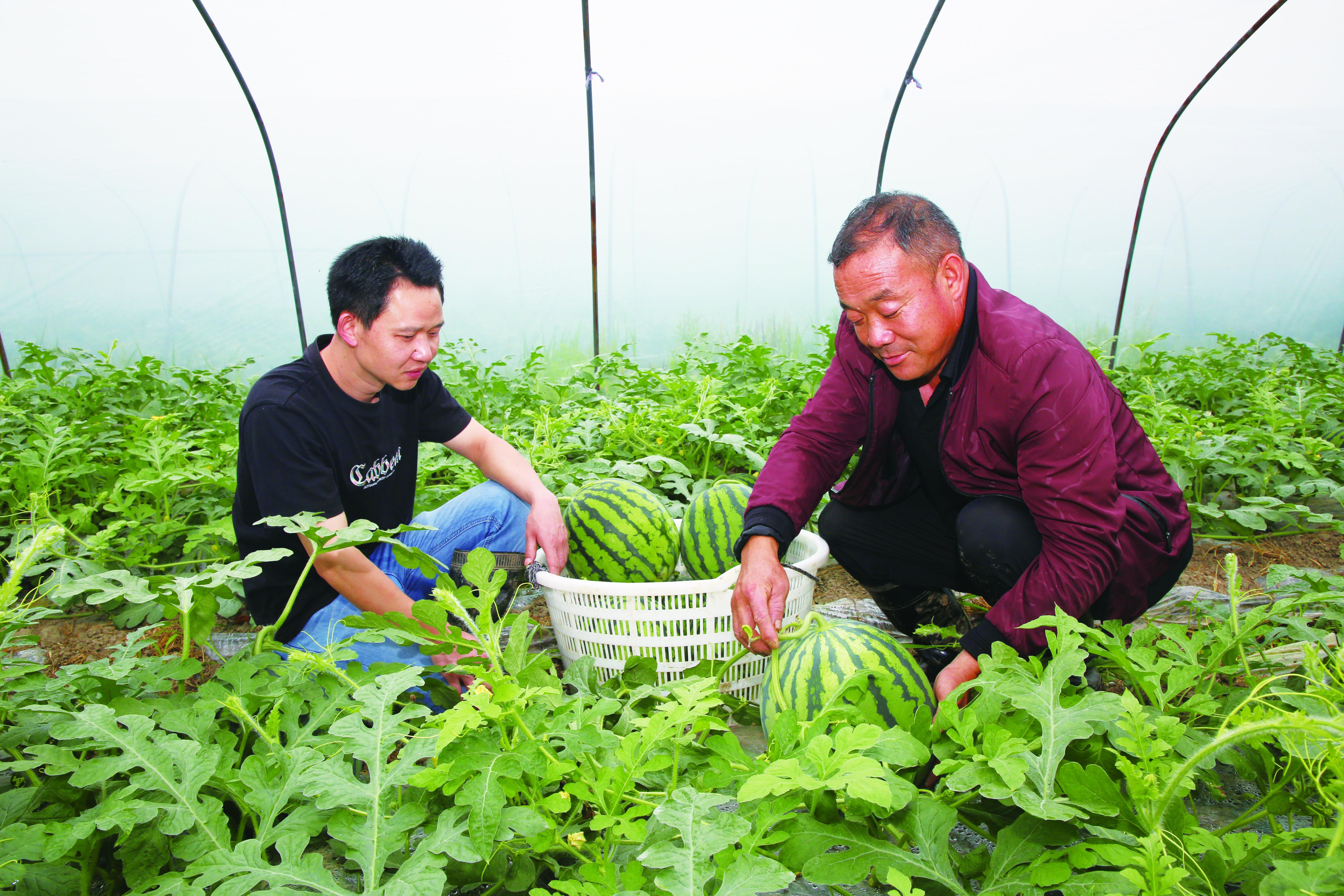 李依旭(右)在大棚里采摘西瓜。 通讯员 供图