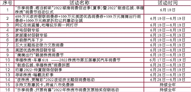 “乐享消费、湘当韵味”2022湖南消费促进季(夏季)启动仪式暨 2022“制造名城、幸福株洲”消费节热辣来袭。株洲拿出800万元财政资金,整合各方资源,向消费者发放7000万元的消费大礼包。