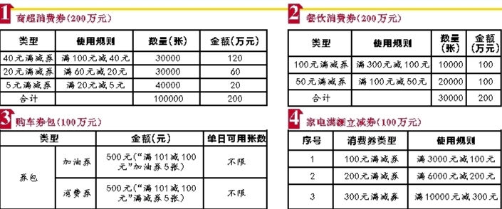 消费券发放:600万元政府银联消费券将于6月10日—8月10日通过银联云闪付App发放。其中,餐饮消费券和商超消费券,均分为四期发放, 6月10日、6月24日、7月8日、7月28日上午10:00开始发放餐饮消费券,上午11:00开始发放商超消费券。家电满额立减券100万元结合大型家电卖场促销活动同步发放,具体发放时间另行确定,将通过多渠道提前宣传、广而告之。汽车消费券包采用“先买车,后申请”的方式发放。个人消费者在参与本次活动的汽车商家购买4万元以上(含4万元,以发票金额为准)的家用乘用车,使用62开头的银行卡或云闪付扫码交易支付车款,通过云闪付App按要求上传购车信息,审核通过后,发放1000元消费券包,其中加油券500元、商超购物券500元。