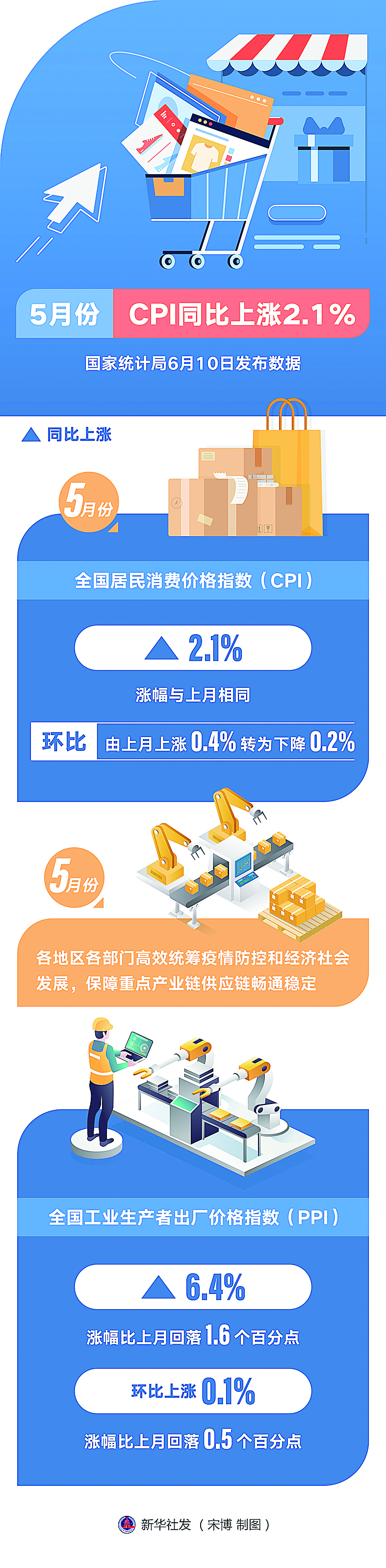 从全国工业生产者出厂价格指数(PPI)看,随着各地区各部门高效统筹疫情防控和经济社会发展,保障重点产业链供应链畅通稳定,5月份PPI同比上涨6.4%,涨幅比上月回落1.6个百分点。