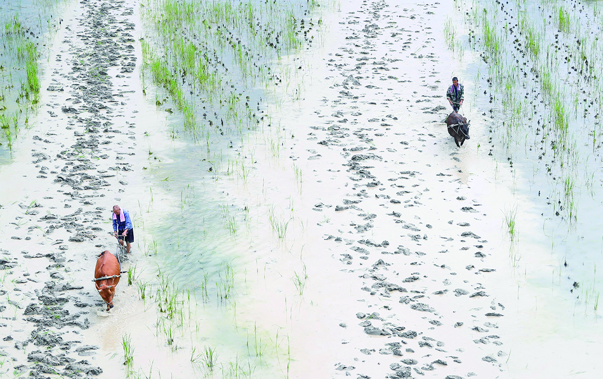 6月6日,在贵州省榕江县寨蒿镇平堡村,村民用耕牛翻耕稻田。 当日是芒种节气,各地农民抢农时、忙耕作,田间地头呈现一派忙碌景象。 新华社发(杨成利 摄)