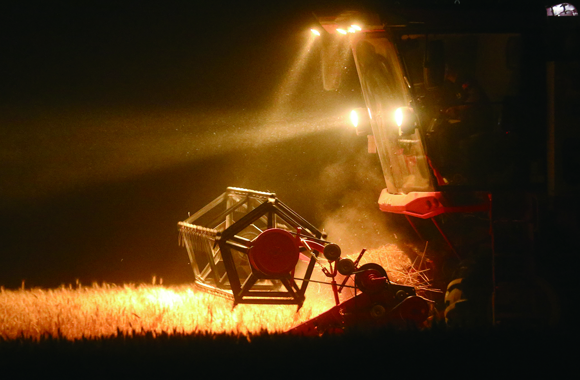 6月7日晚,在山东省临沂市沂南县金桥庄村,农民驾驶收割机收获小麦。 “三夏”时节,在山东省临沂市沂南县麦收现场,收割机连夜抢进度,力保颗粒归仓。