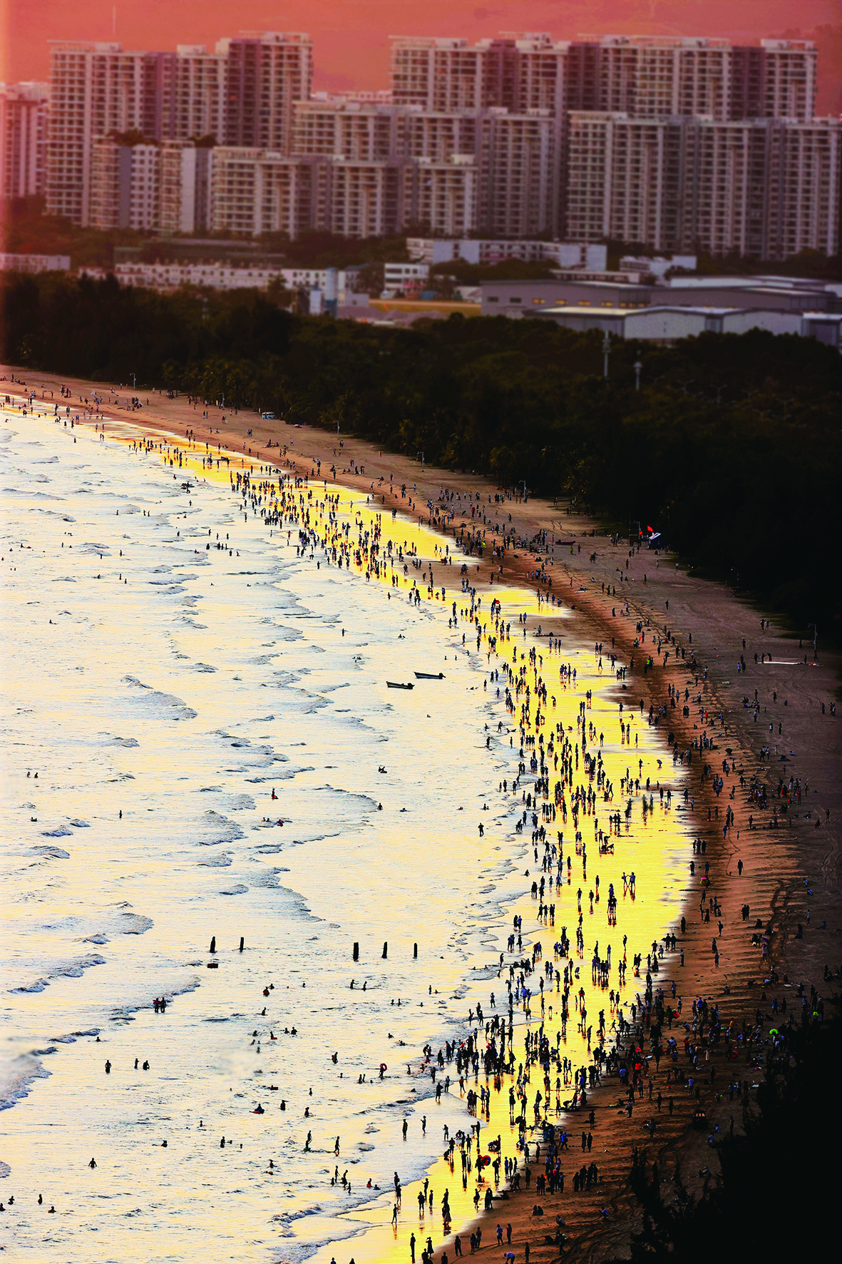 6月4日傍晚,市民和游客在海南三亚湾海边休闲。