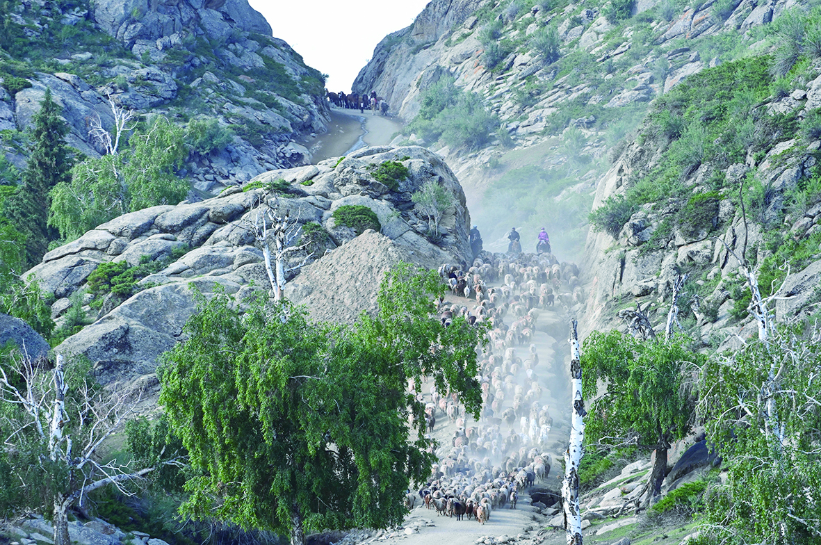 6月5日,在新疆阿勒泰地区福海县沙尔布拉克春秋牧场转往夏季牧场的牧道上,牧民赶着牲畜向夏季牧场进发。