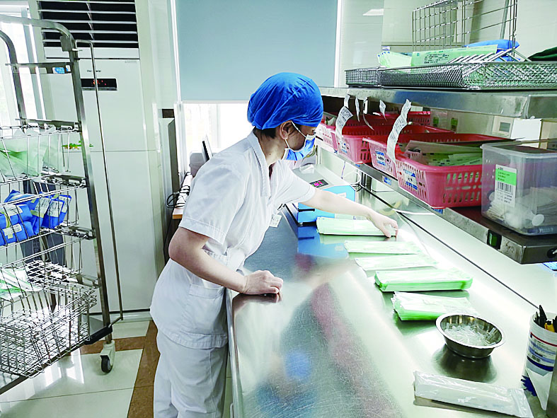 6月9日上午9时40分,在省直中医院消毒供应中心,谭华兰正在有条不紊地进行配包前的准备工作。只见她将右手靠在桌面,用左手将纱布、试管、孔巾等逐一摆放在操作台,再做好记录、打印标签。