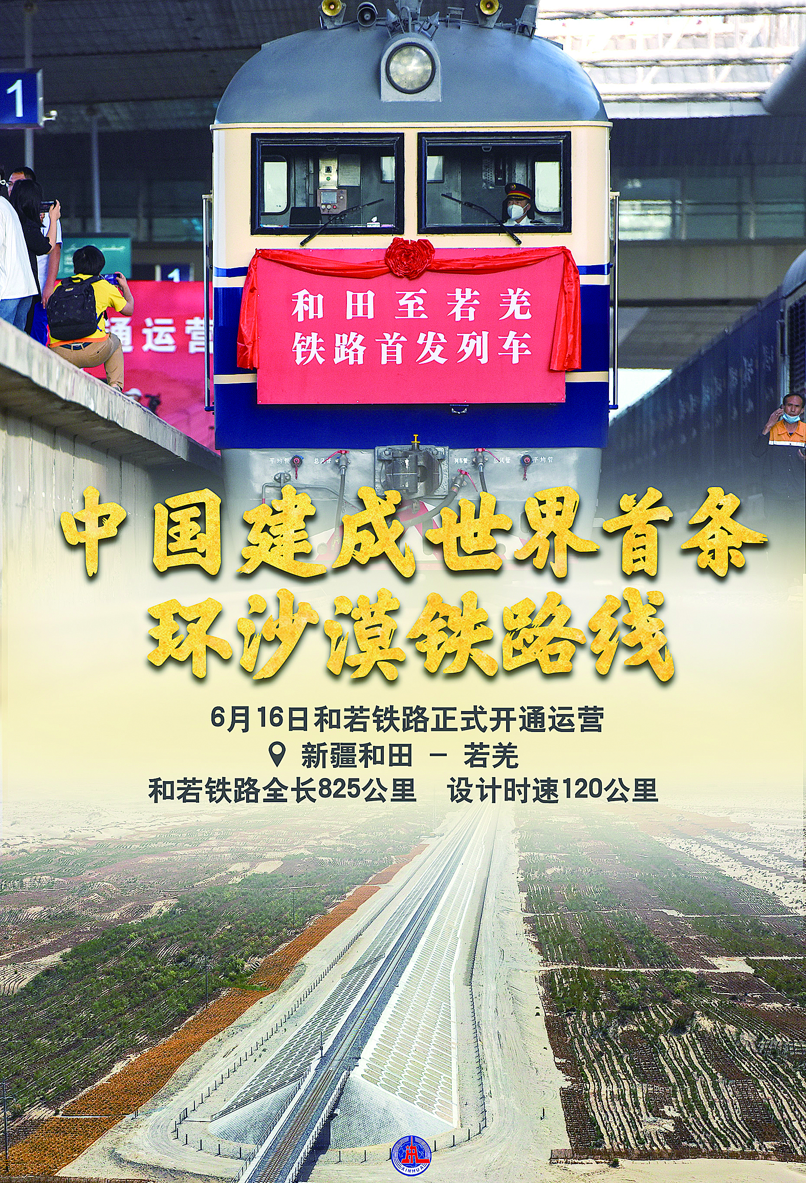 和若铁路全长825公里,设计时速120公里,一路向东穿越沙海,延伸至甘肃、青海和西藏交界的若羌县。它与现有格库铁路、南疆铁路共同构成一条2712公里的环形铁路,“环抱”塔克拉玛干沙漠。这条国家I级单线铁路,串联起沙漠里的点点绿洲,结束了塔里木盆地南缘且末、民丰等5个县和新疆生产建设兵团3个团场不通火车的历史。