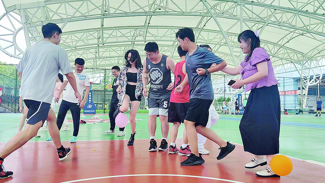 篮球场、排球场和羽毛球场上气氛热烈,大家挥汗如雨,在运动中展示自己的矫健体魄和青春活力;妙趣横生的踩气球运动(见图),更是将现场气氛推向高潮。随后,石峰区新时代文明实践志愿服务总队的心理专家,还与青年职工们就婚恋等问题进行探讨交流。