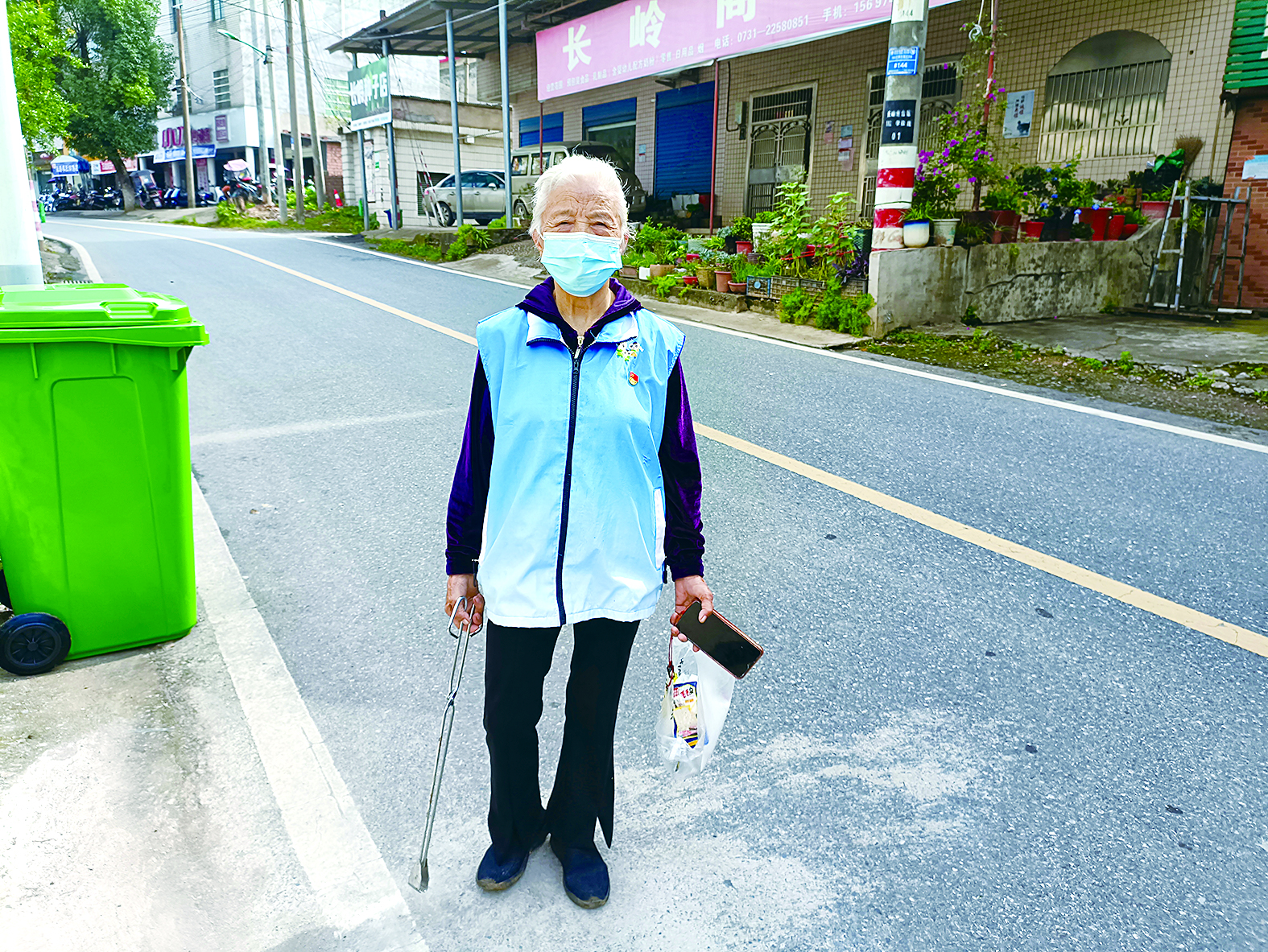 包光良年轻时带领村民共同致富,后来还创建农家书屋,丰富村民的精神文化生活。图为包光良在清理路边垃圾。