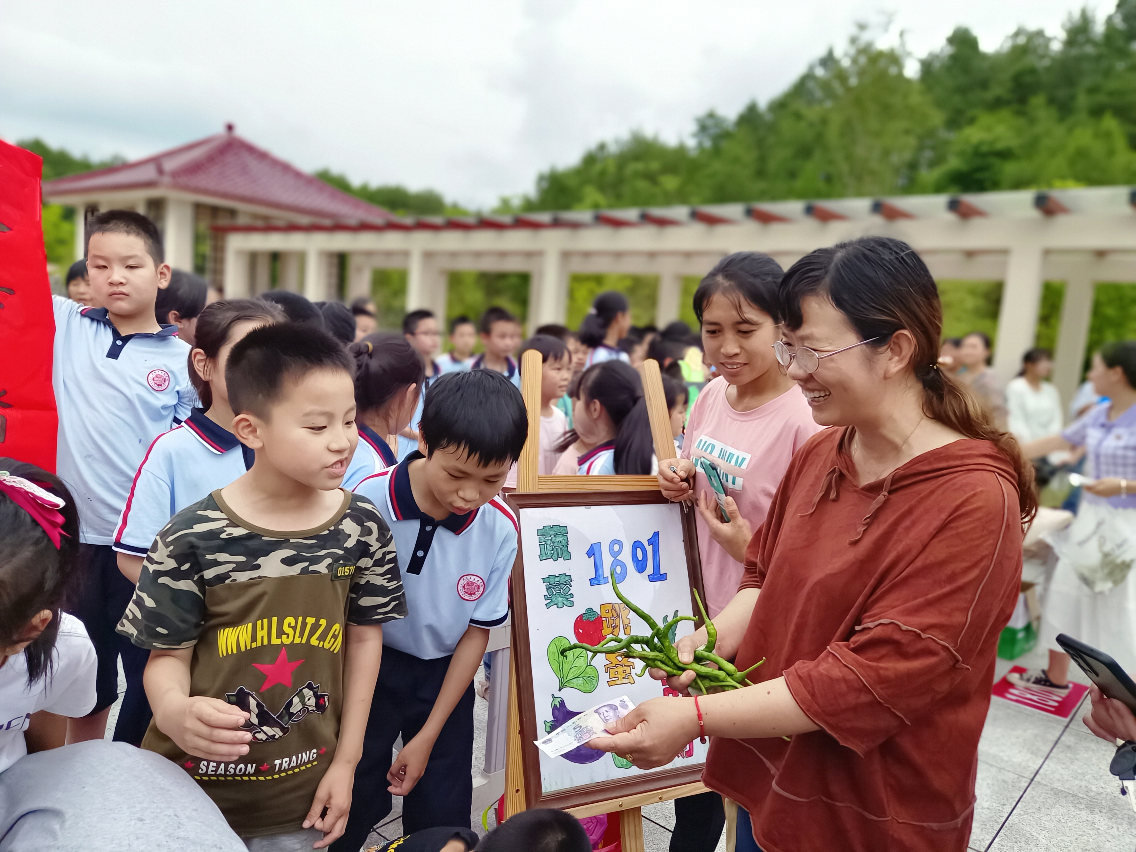 师生们在“耕读园”采摘的蔬菜运至校门前广场“跳蚤市场”,学生分工合作,捆装打包、整理摊位,开始摆摊售卖。此次热卖活动吸引了不少家长和老师前来购买,新鲜的蔬菜不到一小时间就全部售空。