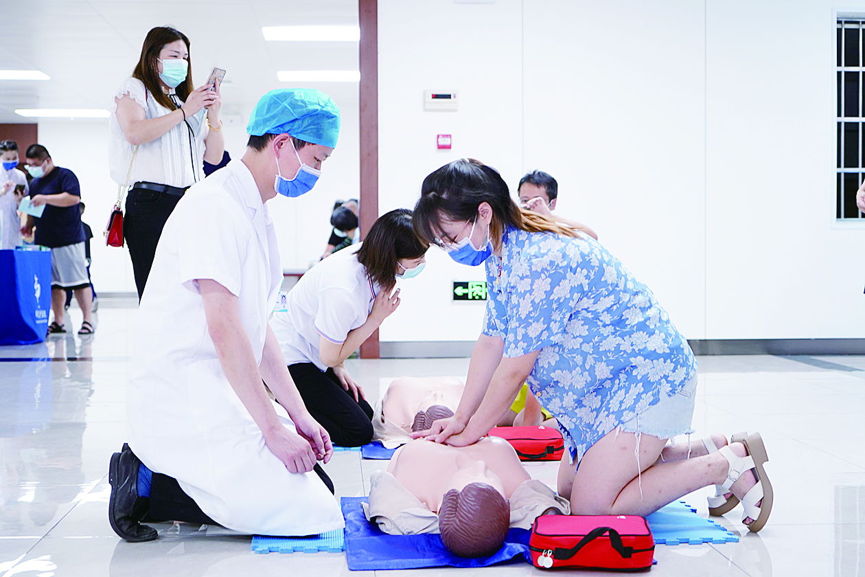 装修改造后的省直中医院门诊大楼,市民正在学习应急救护知识。 通讯员供图