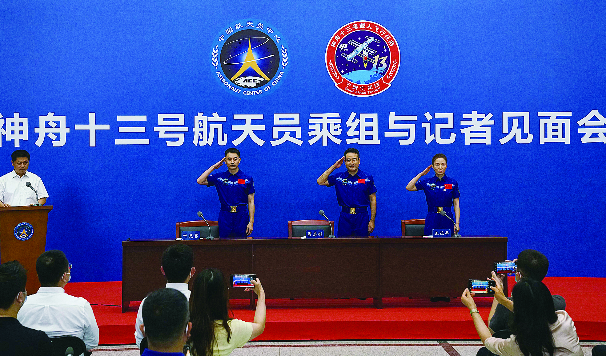 6月28日,神舟十三号航天员叶光富(左)、翟志刚(中)、王亚平(右)敬礼致意。新华社发