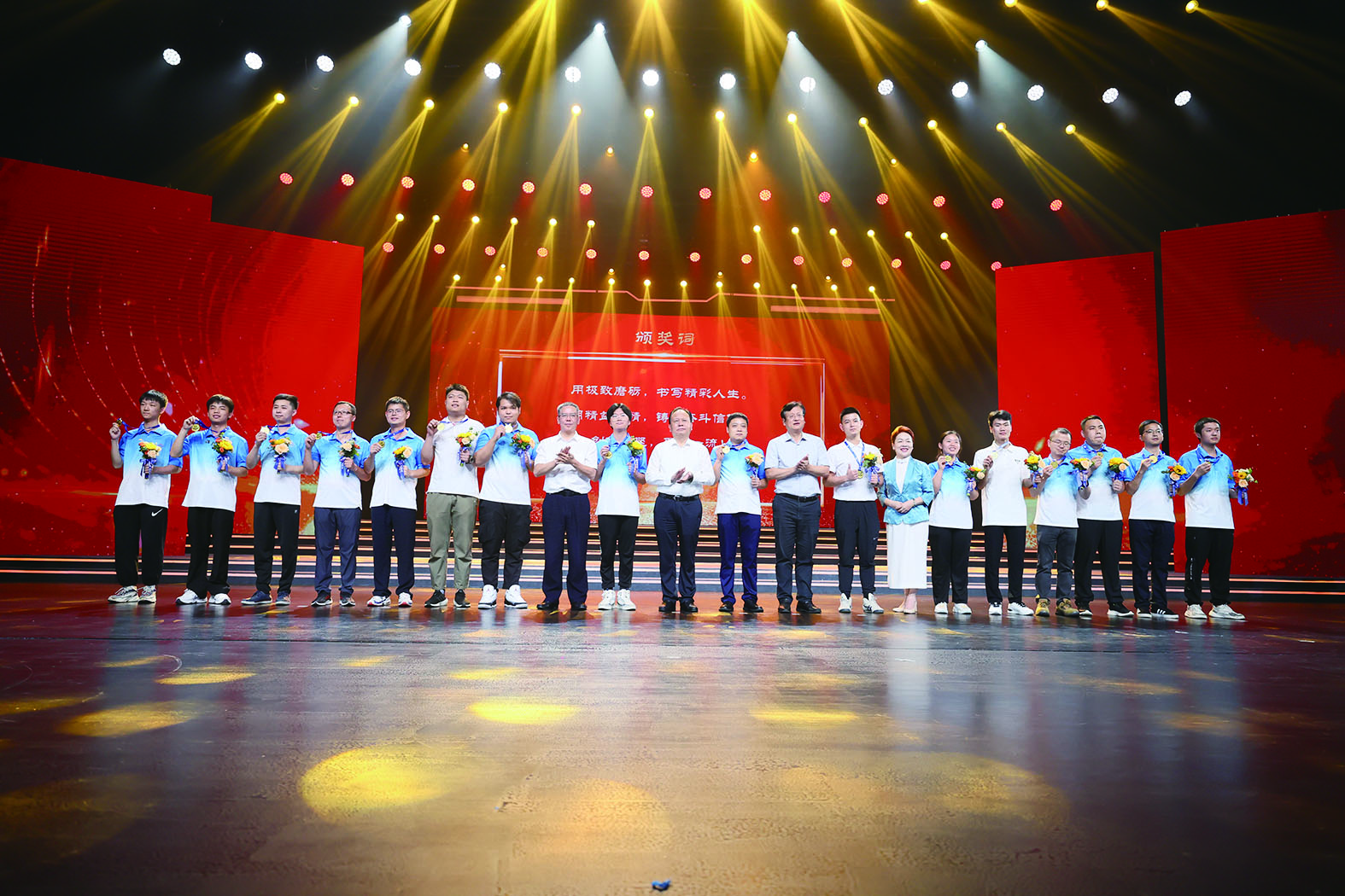 7月6日晚,湖南省第一届职业技能大赛闭幕式在株举行。图为颁奖领导与大赛获奖者(部分)一起合影。 株洲日报全媒体记者/易翔 摄