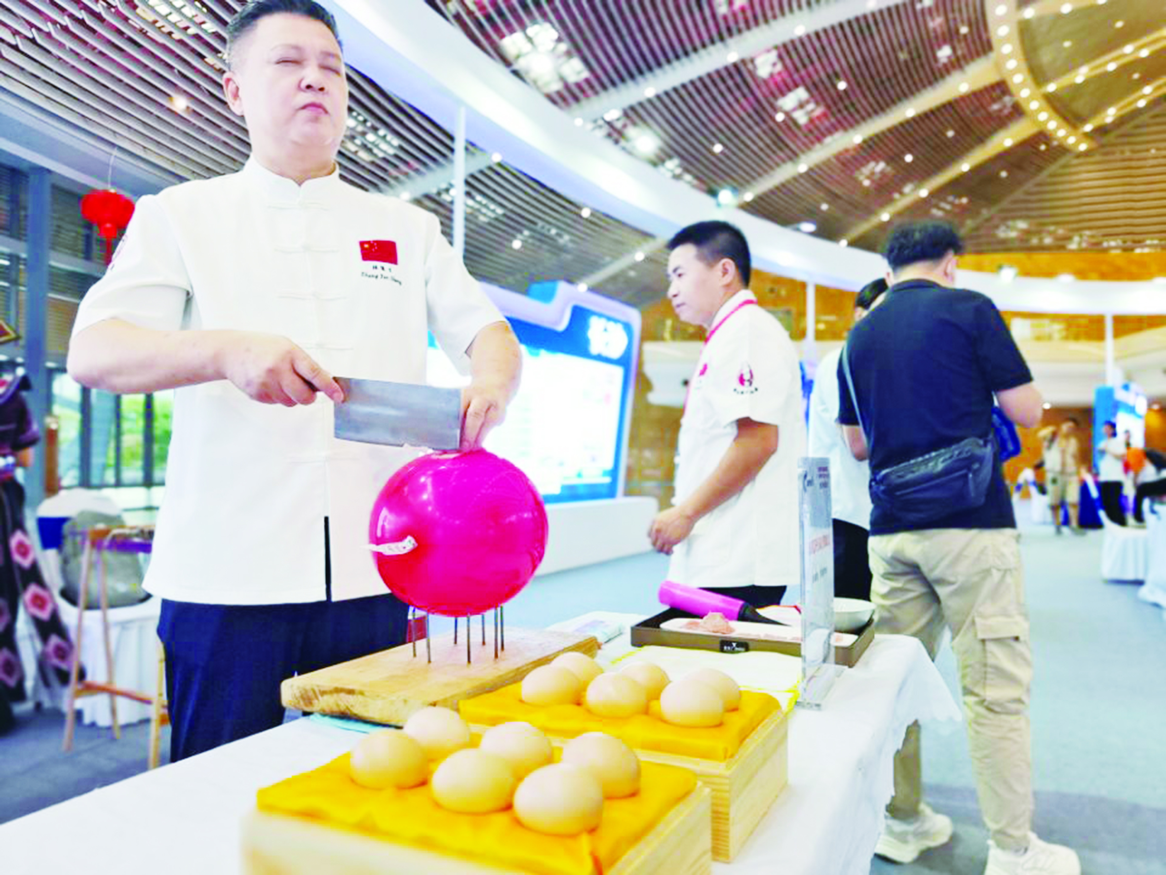 台上一分钟,台下十年功。张竣生说,练了两三年,每天至少练三次,前期废了不少鸡蛋、气球才得以练成。“练习气球切肉丝,除了可以提升专业烹饪刀法和平衡能力,还可以净心静气,陶冶情操。”张竣生笑道。