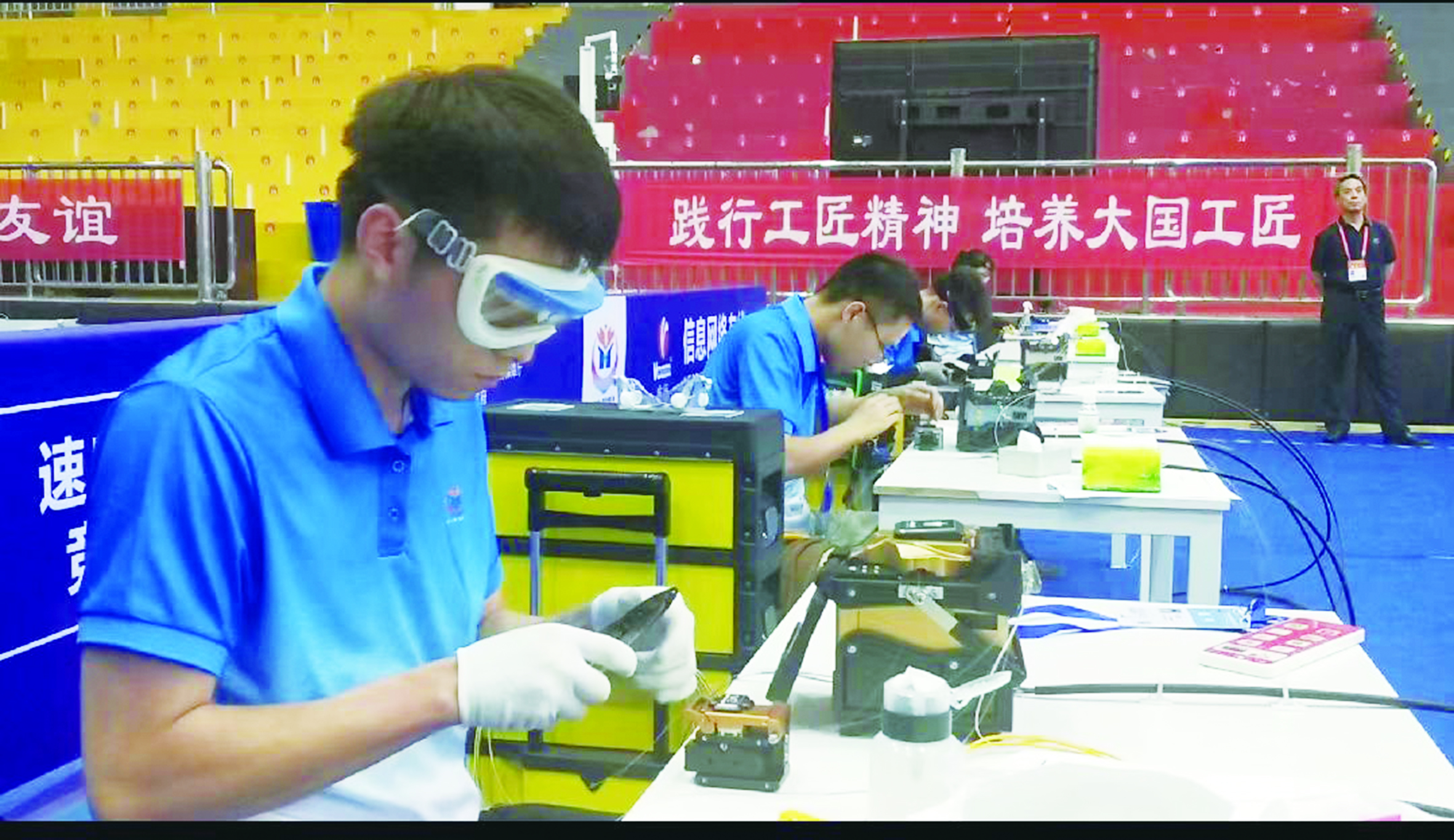 卢勤介绍说,信息网络布线赛项要求选手使用比赛提供的设备材料,利用广域网、局域网、有线电视、无线网络等通信网络技术,按照行业标准完成结构化布线施工、测试、维修维护以及无线设备调试等竞技内容。比赛过程中,选手们需要用锋利的刀具切割线缆。以往比赛,由于时间紧张,有些选手不遵守安全操作规范,受伤现象时有发生。他点评说,本场比赛,场地布置规范、选手们竞技水平高、赛项内容完成度高,这是一场高水平的、令人赏心悦目的比赛。