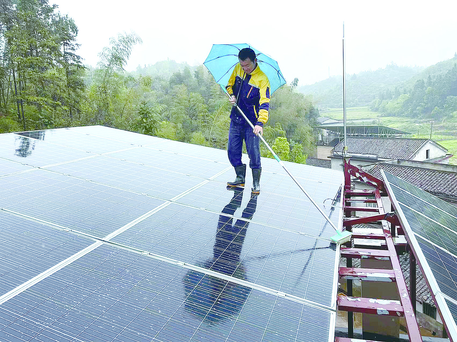 维保人员正在进行光伏面板的清扫保养,以确保发电量。 受访者供图