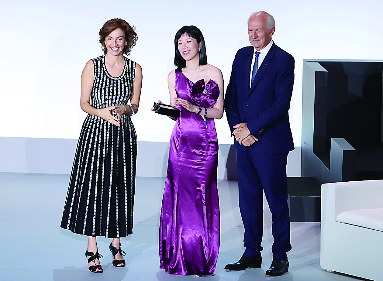 6月23日,在位于法国巴黎的联合国教科文总部,胡海岚(中)获颁“世界杰出女科学家奖”。 中国浙江大学神经科学中心执行主任胡海岚与另外4名女科学家获颁本年度这一奖项。教科文组织在此前发布的评奖信息中说,胡海岚“因在神经科学方面的重大发现而获奖。她的工作促进了新一代抗抑郁药物的研发”。