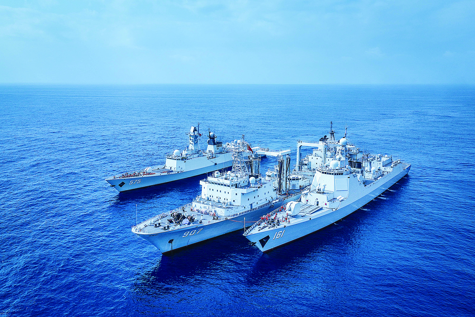 中国海军第40批护航编队骆马湖舰(中)同时为岳阳舰(左)、呼和浩特舰进行补给(2月27日摄)。新华社发