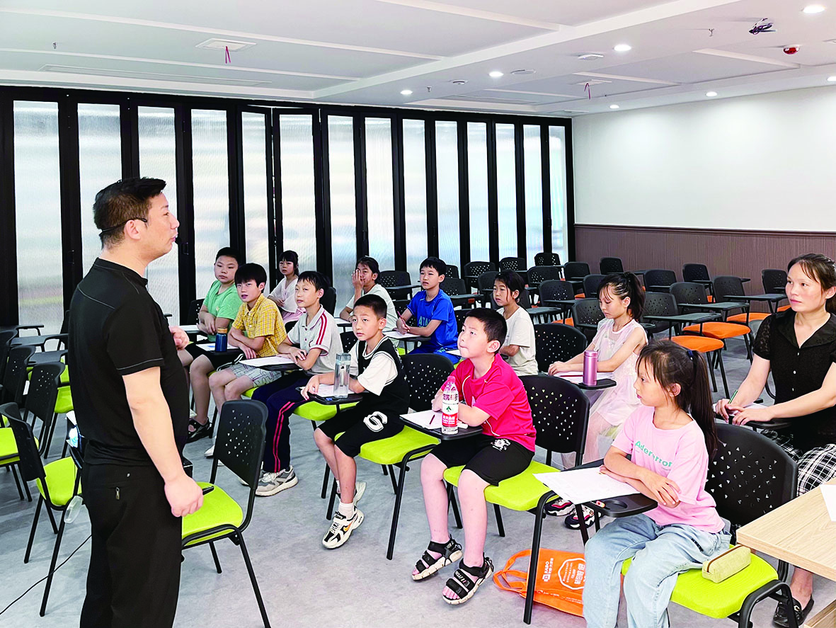 “今天我们先来学习写长平横,运笔口诀是顿、横、顿、回……”7月4日,天元区栗雨街道菱溪社区,10多个小朋友正聚精会神听老师讲硬笔书法的要领。