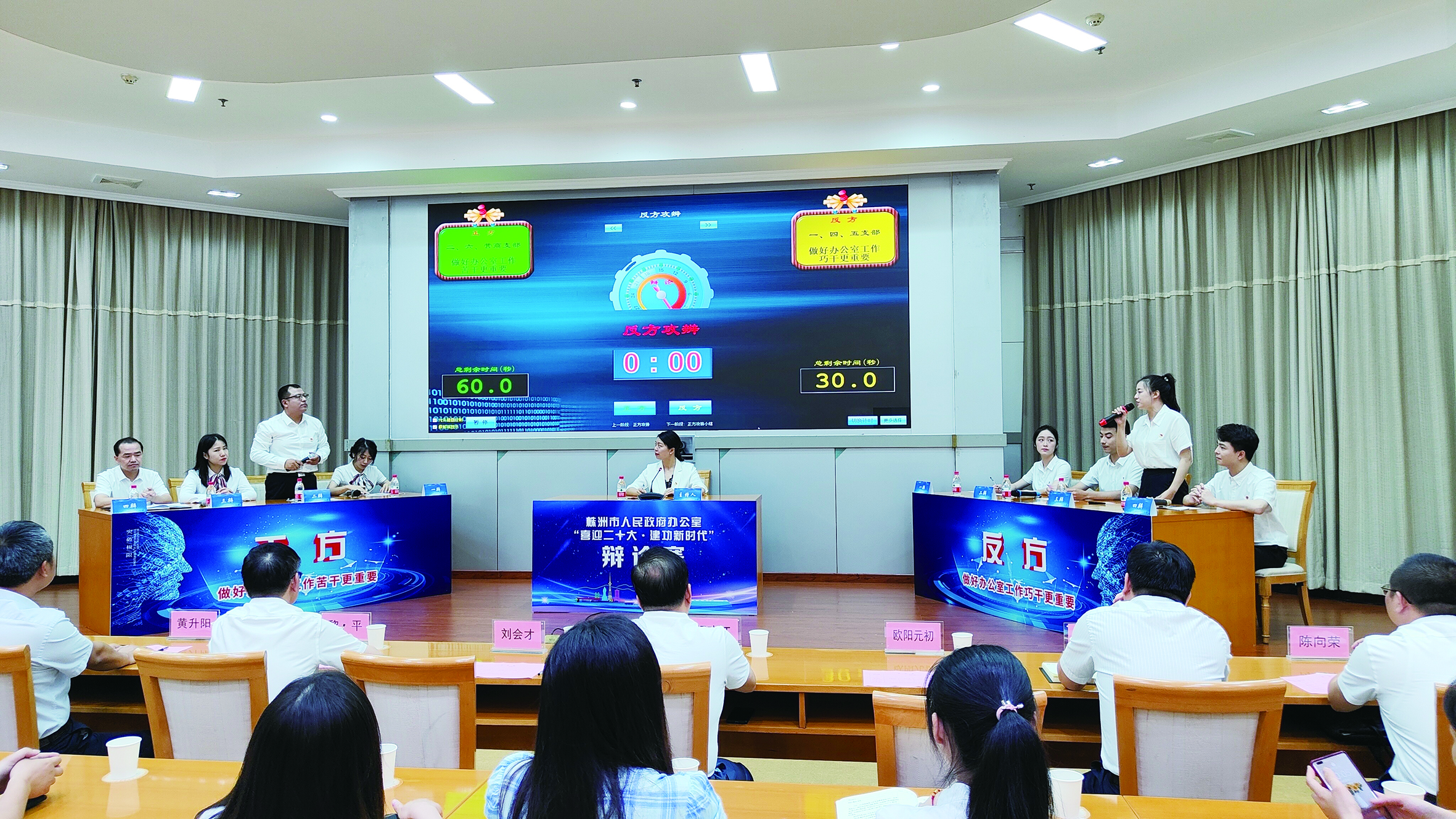 近日,市政府办以“喜迎二十大,建功新时代”为主题,组织全体党员重温入党誓词,为老党员颁发“光荣在党50年”奖章;8名青年党员干部还分成正反两组,围绕“做好办公室工作苦干巧干哪个更重要”展开激烈辩论(见上图)。全办党员干部决心围绕中心、服务大局,以参谋辅政为发展增效力,以统筹协调为发展添合力,以狠抓落实为发展强动力,以昂扬的精神面貌迎接党的二十大胜利召开。