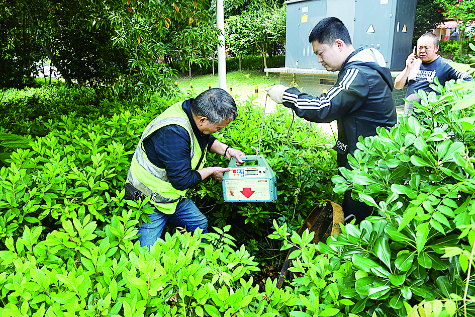 湘水湾小区,熊师傅和同事在对居民反映的漏点听漏。