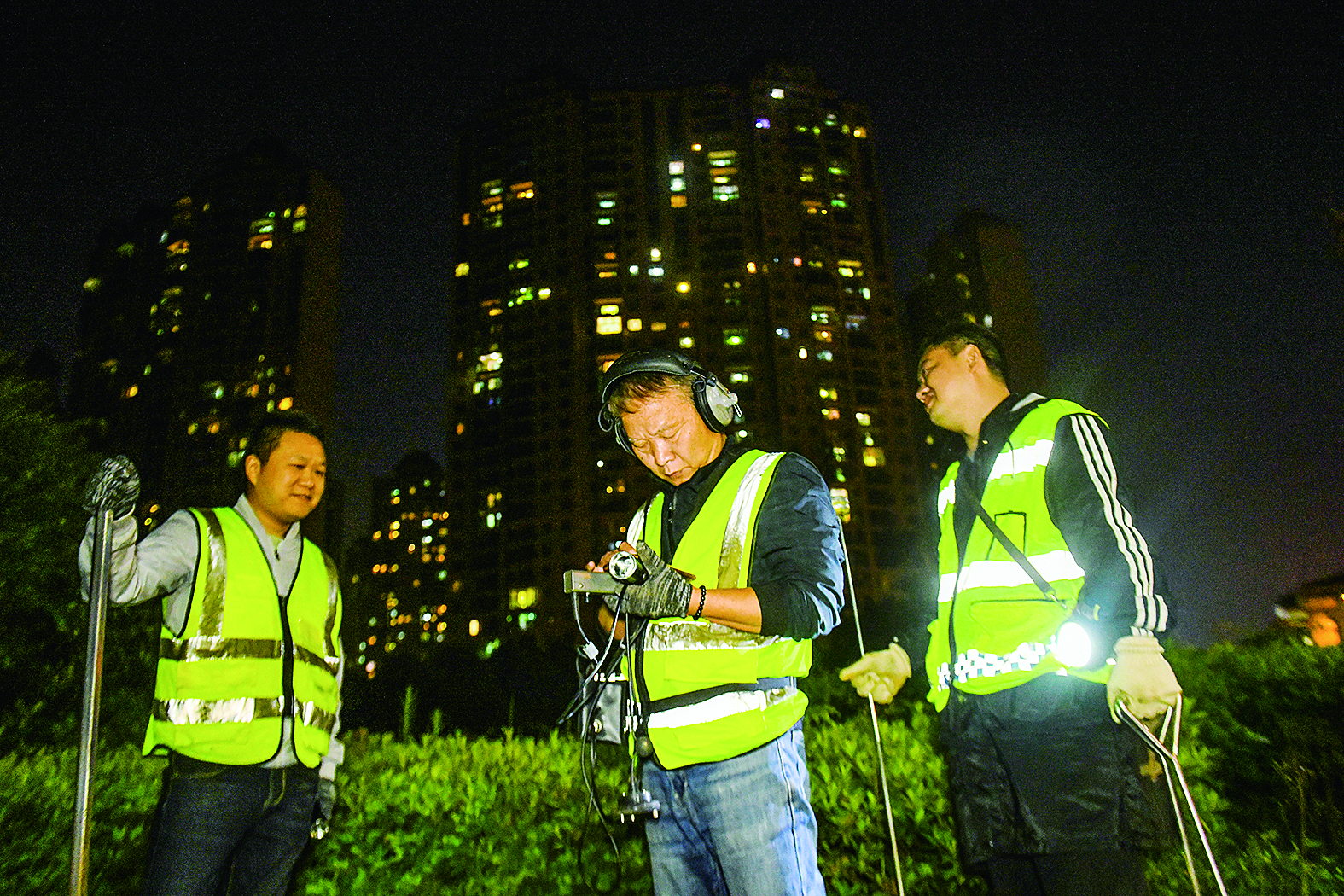 深夜,进行下井听漏操作。