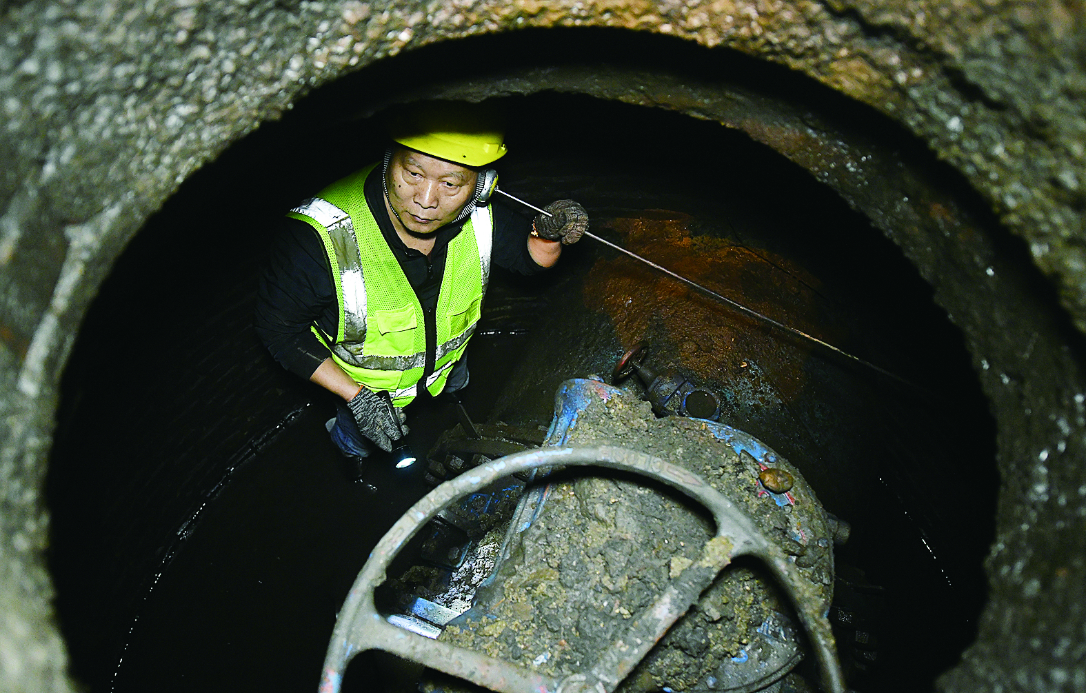 凌晨时分,熊师傅深入地下管道听漏。