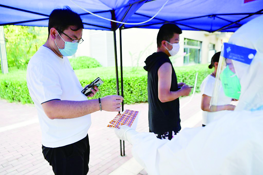 7月8日,志愿者(右)向西安市曲江新区紫汀苑社区居民发放核酸检测贴纸。 新华社记者 张博文 摄