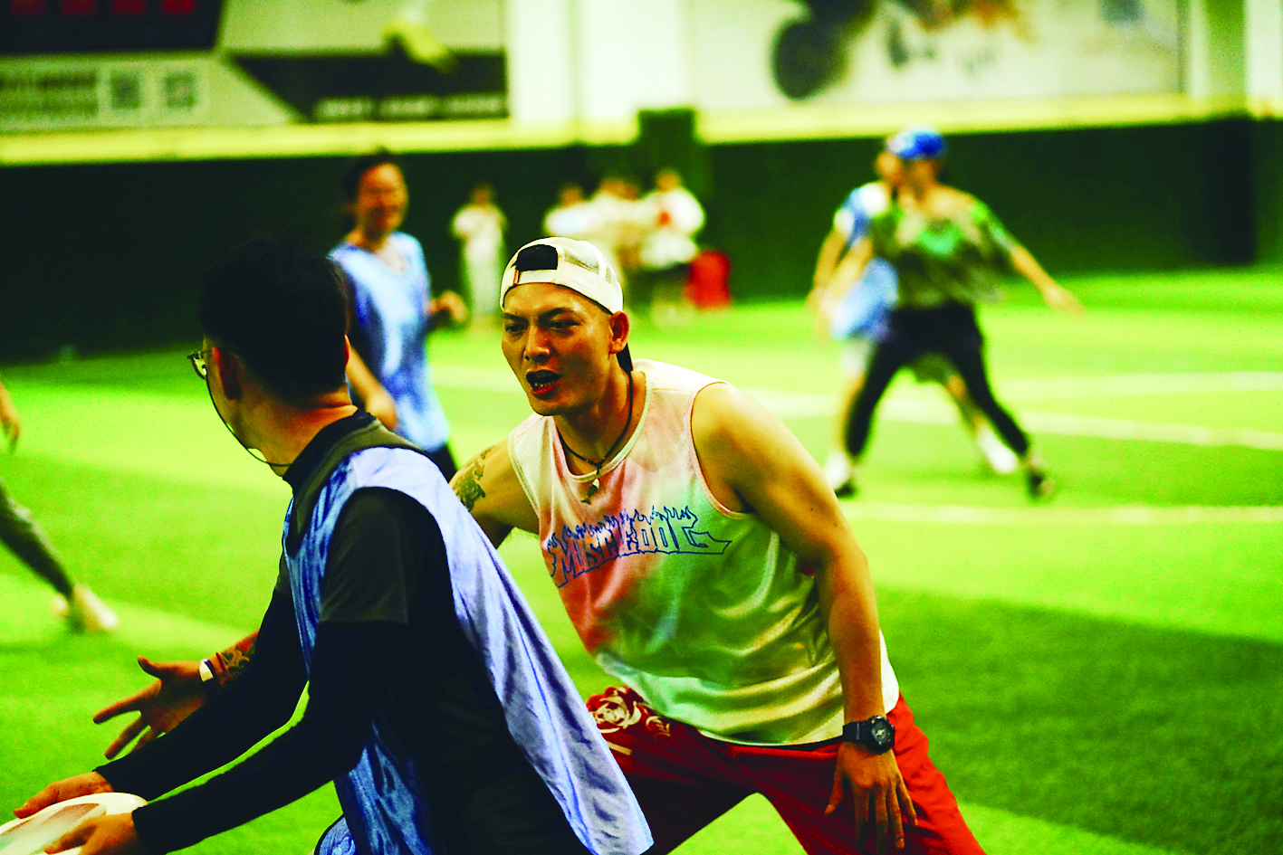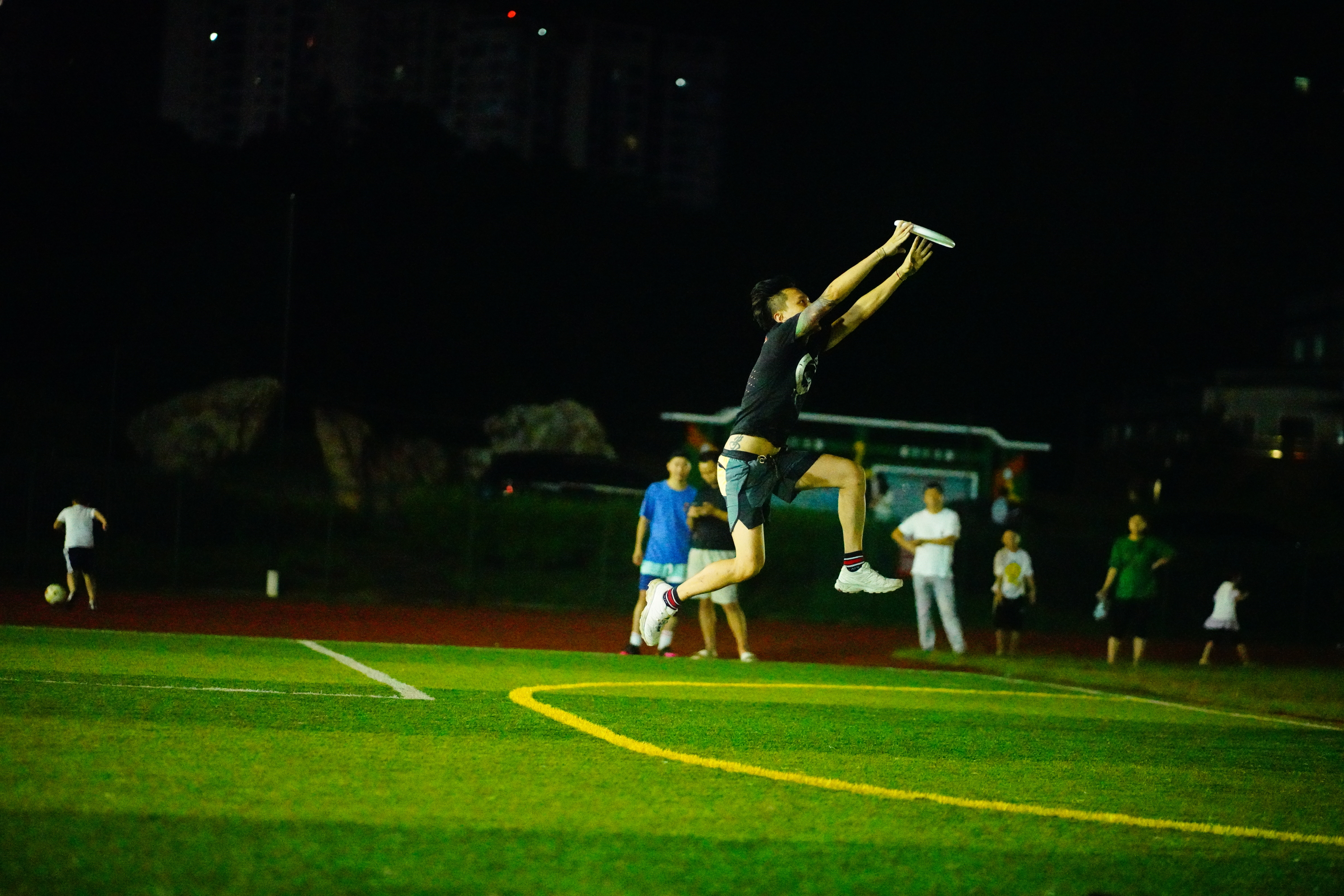 7月10日晚九点,市体育中心,巨大的探照灯将球场铺得婉如白昼。球场上正在上演各类体育活动。一场飞盘比赛已然打响。