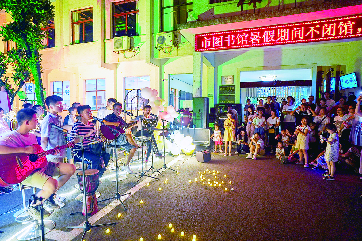 7月16日晚,株洲市图书馆举办了夜间文化活动“这个夏天,我在图书馆等你”的第一期“青年歌会”。志愿者团队为市民表演吉他弹唱和街舞。暑假期间,每周六市图书馆都会开展不同主题的夜间文化活动,有诗歌朗诵会、少儿经典诵读等,欢迎市民朋友参加。