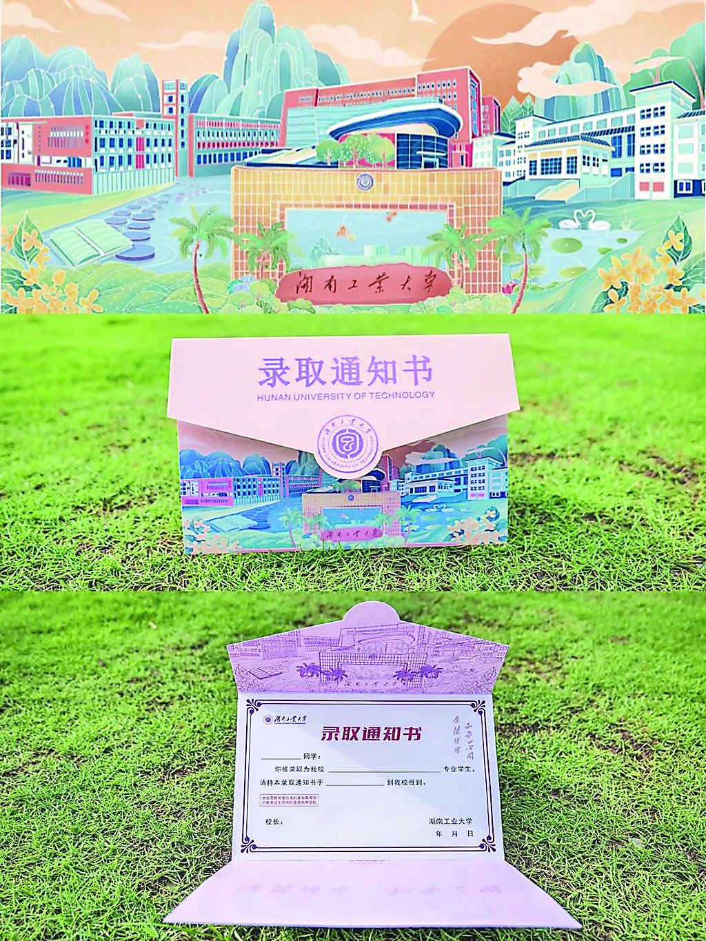 记者昨从湖南工业大学获悉,该校官方微信公众号公布了该校2022年高考录取通知书。 今年该校的录取通知书整体设计主题为“鱼跃龙门,春华秋实”,寓意新一届学子在经历层层考验后在金秋时节来到美丽的校园。 株洲日报全媒体记者/谭筱 通讯员/谭珊琦 摄