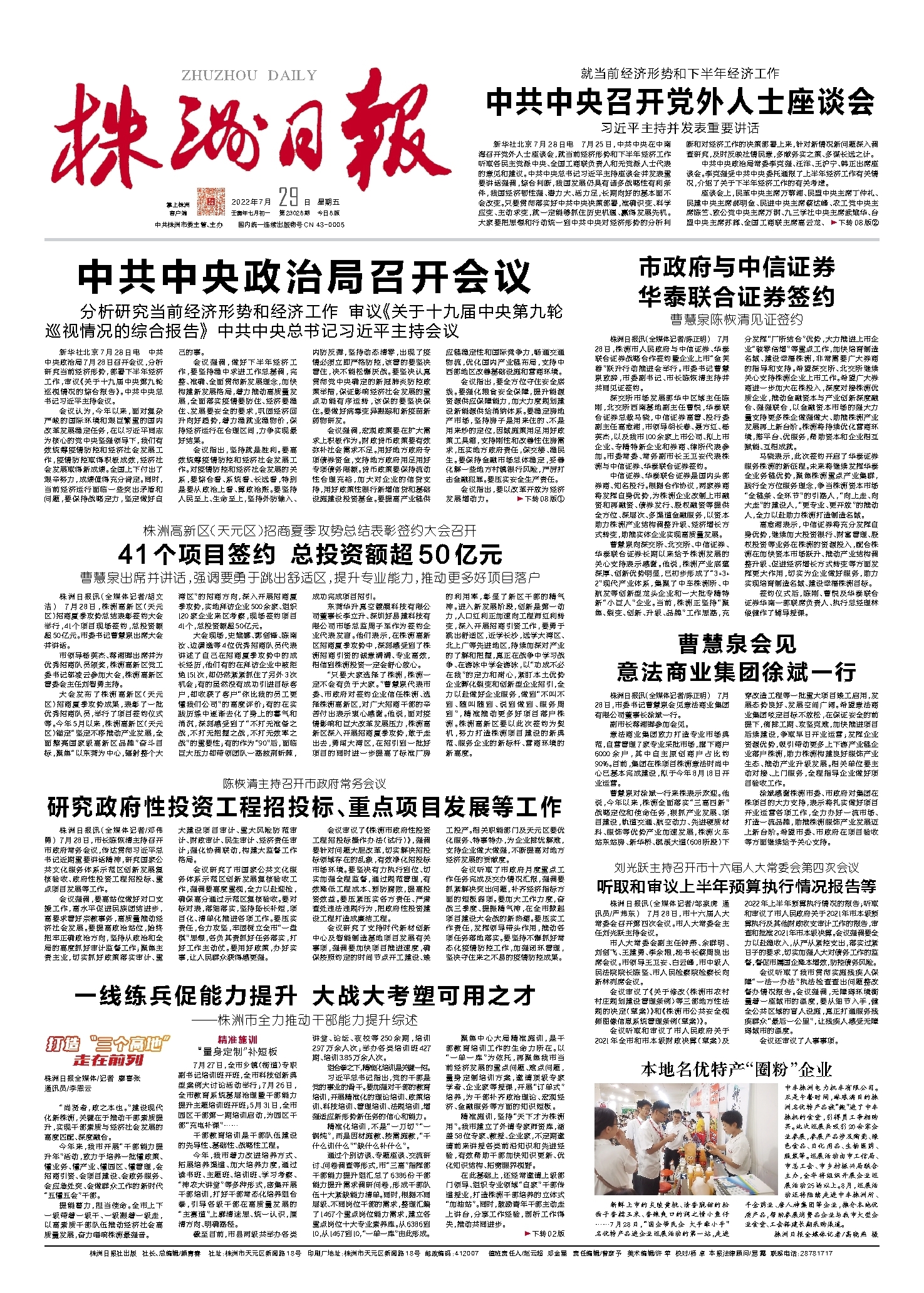 • 新华社北京7月28日电 7月25日,中共中央在中南海召开党外人士座谈会,就当前经济形势和下半年经济工作听取各民主党派中央、全国工商联负责人和无党派人士代表的意见和建议。中共中央总书记习近平主持座谈会并发表重要讲话强调,综合判断,我国发展仍具有诸多战略性有利条件,我国经济韧性强、潜力大、活力足,长期向好的基本面不会改变。只要贯彻落实好中共中央决策部署,准确识变、科学应变、主动求变,就一定能够抓住历史机遇、赢得发展先机。大家要把思想和行动统一到中共中央对经济形势的分析判断和对经济工作的决策部署上来,针对新情况新问题深入调查研究,及时反映社情民意,多献务实之策、多谋长远之计。