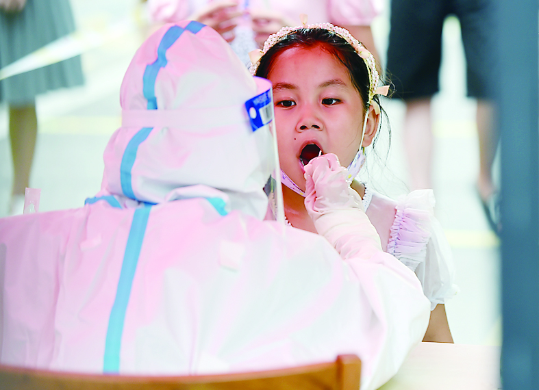 7月16日,在蚌埠市蚌山区和平社区,医务人员为居民进行核酸采样。