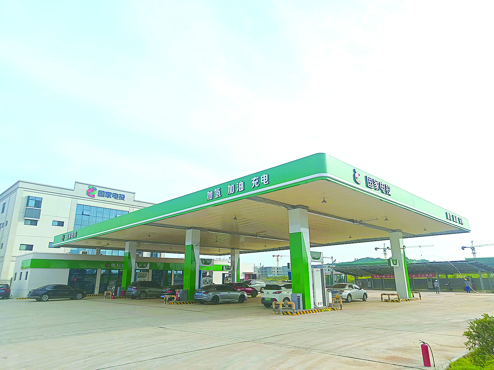 这是一个油氢电综合智慧能源站,由国家电投五凌电力(湖南分公司)投建,总投资额超一亿元。不仅能够加氢,还能为电动车充电,为柴油车、汽油车加油。“在氢能产业尚未大量应用前,油电部分的利润可有效带动站内运营。”负责人范磊表示,全球能源结构不可能一步到电能,更不可能一步到氢能,综合智慧能源站的建立,就是在探索一种新能源过渡路径。