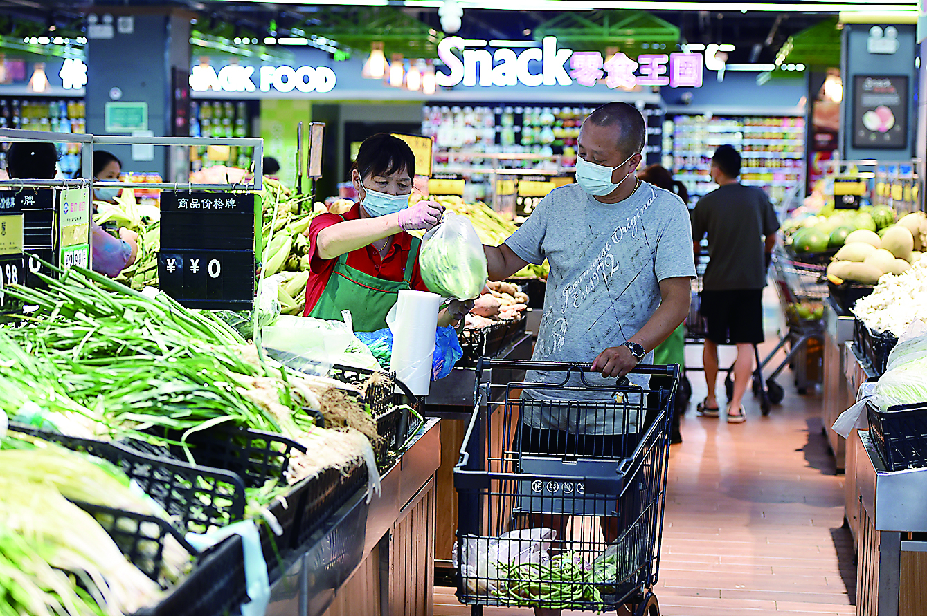 7月17日,市民在安徽省蚌埠市蚌山区华运超市文化广场店选购蔬菜。 据安徽省卫健委通报,7月17日0-24时,安徽省报告新增本土确诊病例3例(均在蚌埠市怀远县),新增本土无症状感染者52例(蚌埠市怀远县46例、禹会区6例)。面对疫情,蚌埠当地农产品批发市场、物流园、超市等积极采取措施,通过签订保供协议、及时补货、延长超市营业时间等方式,全力保障民生商品供应。