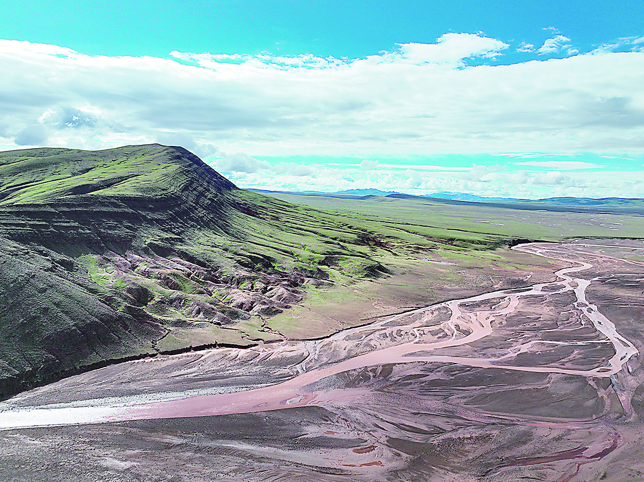 这是7月18日在可可西里拍摄的“红山脉”(无人机照片)。 近日,正在进行的中国地质大学(武汉)长江源科考活动中,科考队在可可西里发现一处当地罕见的大规模“红山脉”。可可西里盆地的这些“红山脉”主要形成于距今7000多万到3000万年之间的白垩纪晚期到古近纪,其中包含的丰富地质信息与青藏高原隆升过程密切相关,将为深入研究青藏高原演化提供重要支持。 新华社记者 张龙 摄