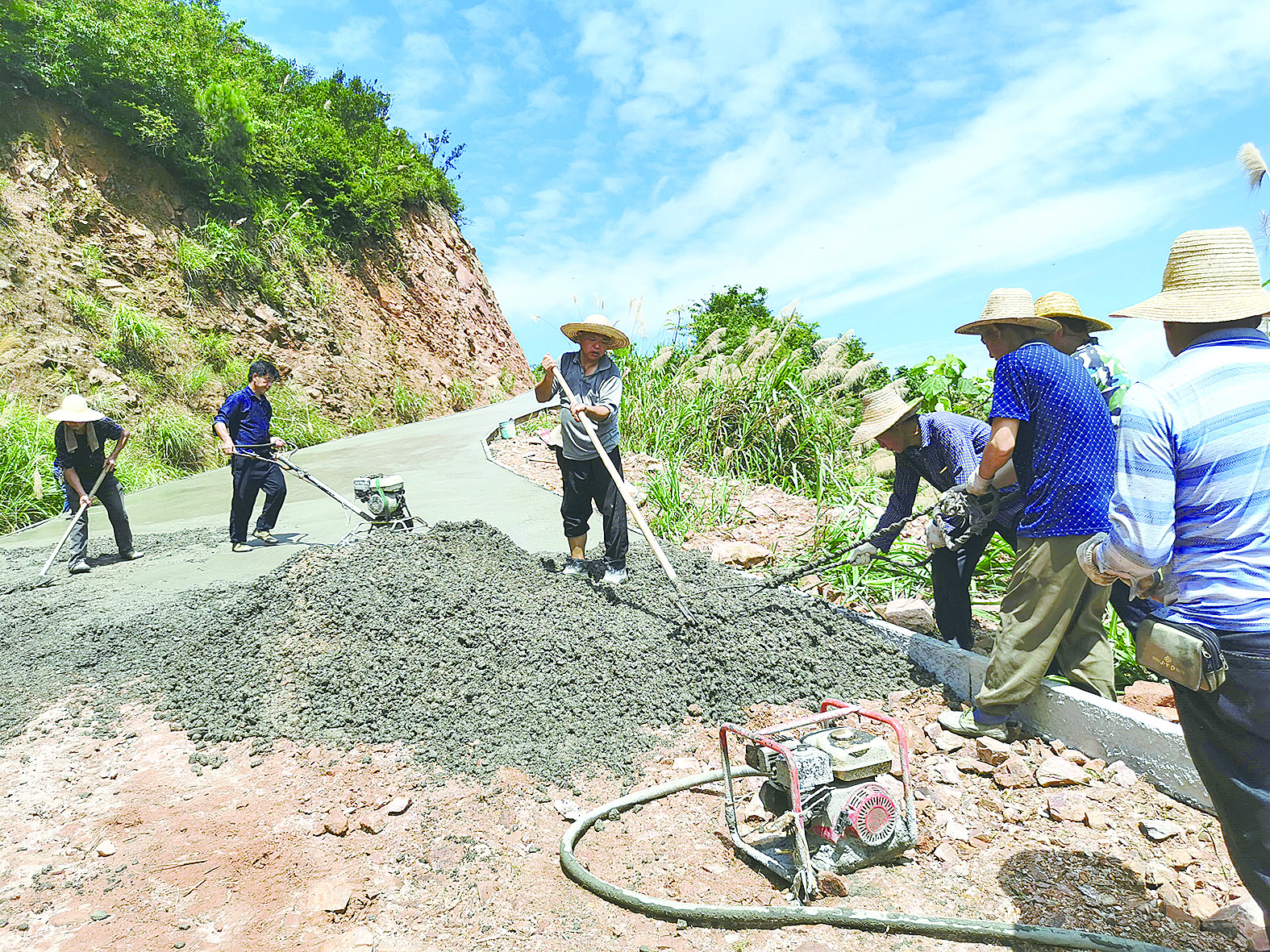 天气再热,驻村工作也不能松劲歇气。顶着骄阳,我们工作队和村干部来到蓬源峰公路项目现场,查看施工进度。施工人员头戴草帽、脖子上挂着毛巾,有序铺设水泥混凝土路面,汗水打湿了衣衫。