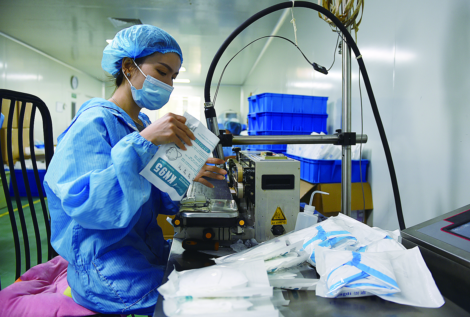 面对疫情,安徽省蚌埠市加强医疗物资保供,助力疫情防控。近日,在蚌埠市一家生物科技企业,工人将生产完成的口罩打包封口。