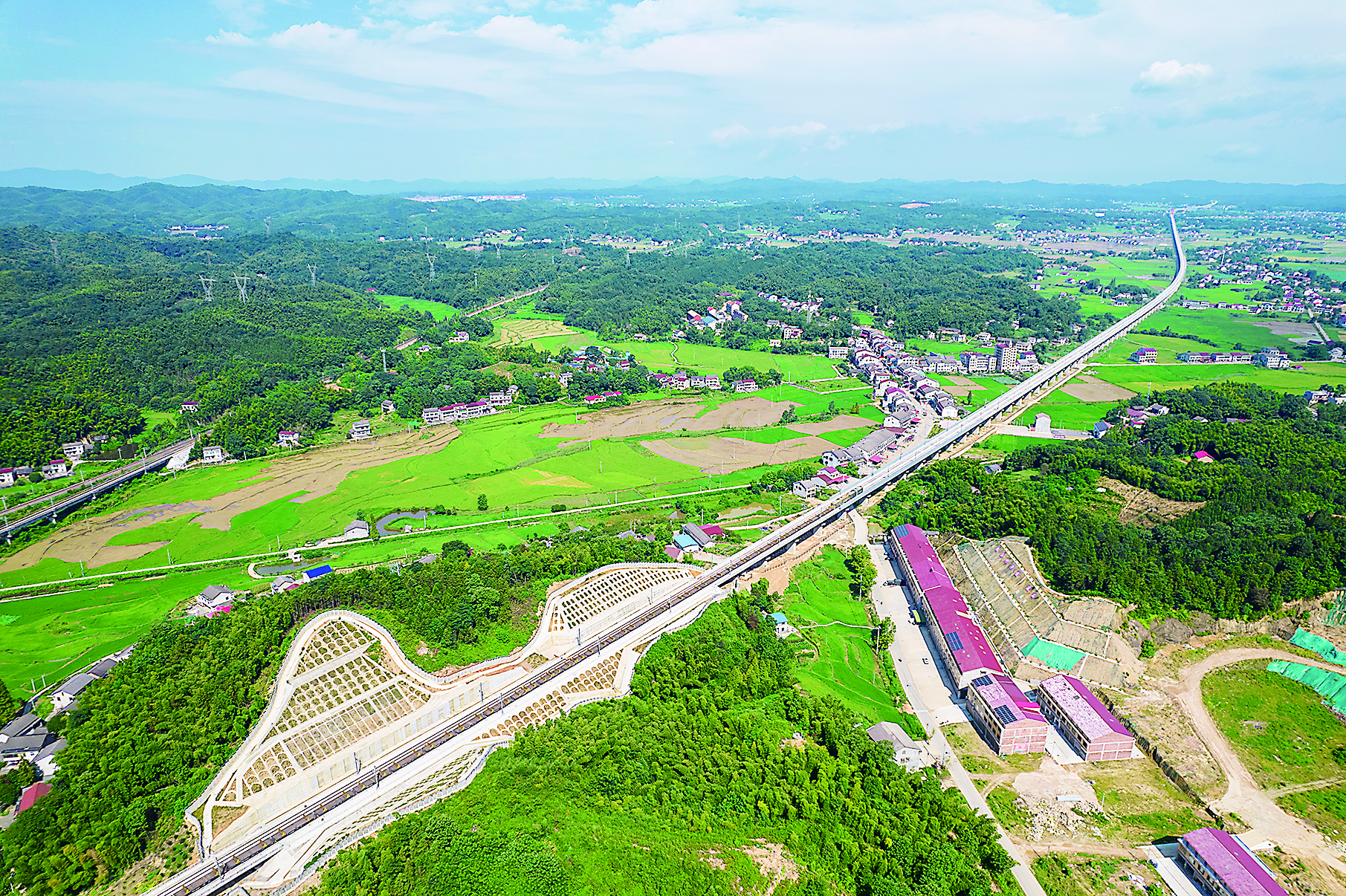这是7月23日在湖南省益阳市桃江县拍摄的常益长铁路(无人机照片)。 当日,在常(德)益(阳)长(沙)铁路常益段铺轨现场,随着中铁十一局施工人员将最后一对钢轨铺设在线路左线的无砟轨道板上,常益长铁路全线轨道贯通。 据了解,常益长铁路线路全长约157公里,设计时速350公里,是国家“八纵八横”高速铁路网的重要组成部分,建成后将实现湖南全省14个市州全部通高铁的目标。 新华社发