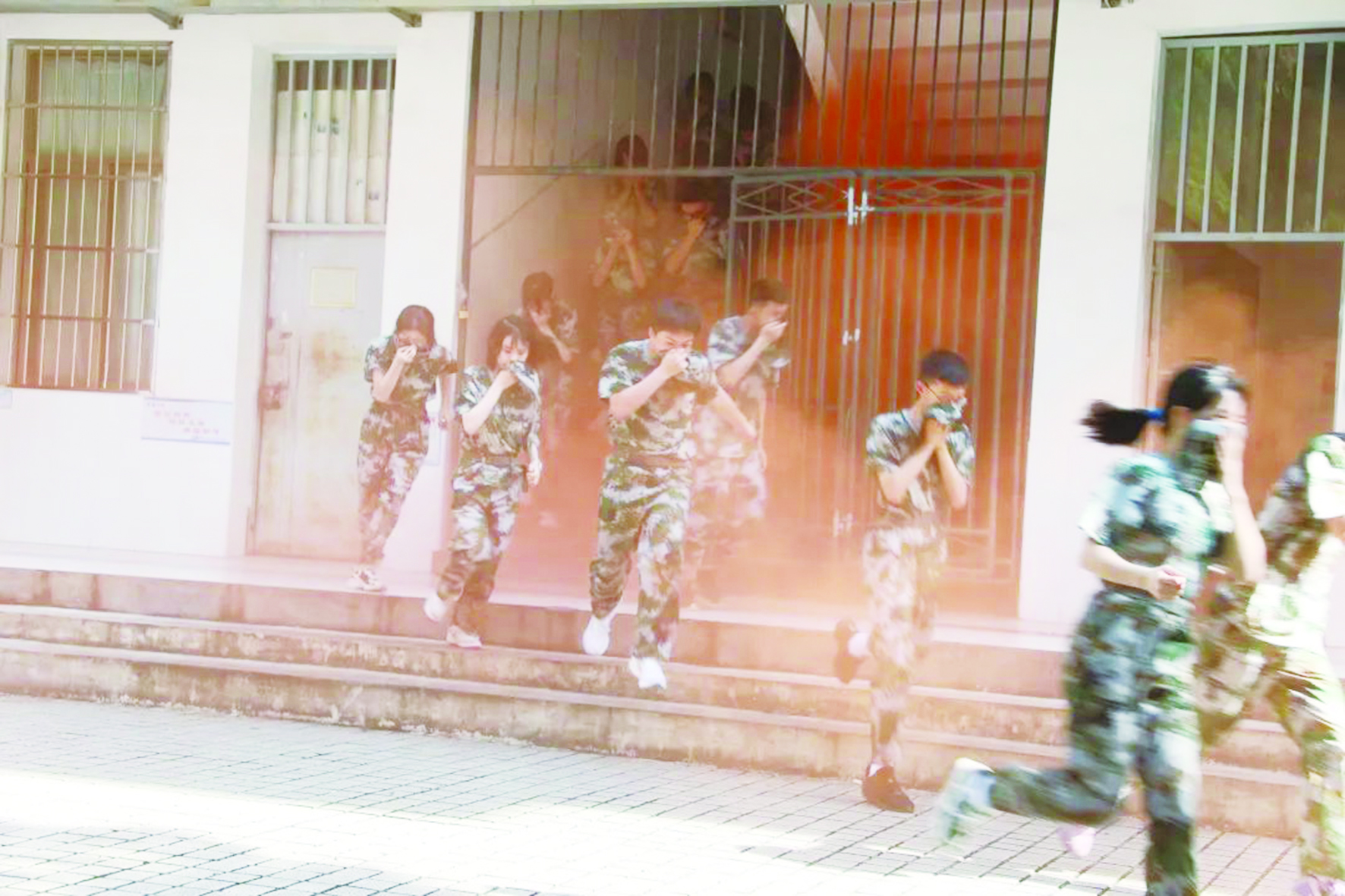 “呜……”当刺耳的警报声响起,所有新生班主任迅速到达教学楼各楼层指定位置,指导学生捂住口鼻,弯腰俯身,沿着指定楼梯口及路线迅速向操场安全地带撤离。学生们借用身边的衣物、纸巾等物体掩住口鼻,有条不紊地快速撤离教学楼。仅用时2分50秒,便完成疏散并在操场集合完毕。